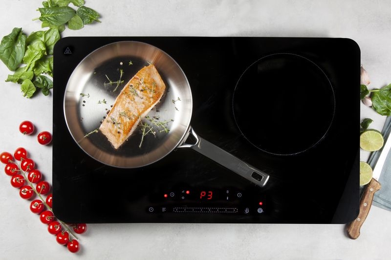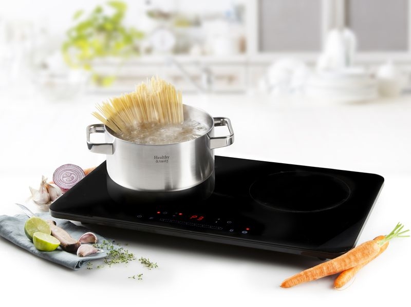 Indukční vařič se dvěma plotýnkami plně integrovanými spolu s dotykovým ovládáním i LED displejem do celoplošné sklokeramické desky. Ovládací prvky a displej jsou tak plně chráněny proti poškození. Indukční vařič disponuje nastavením výkonu v 7 stupních, nastavením teploty vaření i nastavitelným časovačem. Indukční plotýnky samy rozpoznají vhodné nádobí a v případě použití jiného nádobí se umí samy vypnout. Stejně tak se umí plotýnky samy vypnout a dochladit po sundání nádobí, nebo po uplynutí nastaveného času vaření.