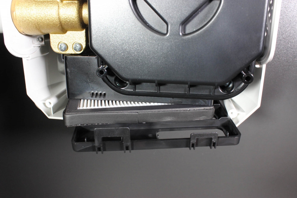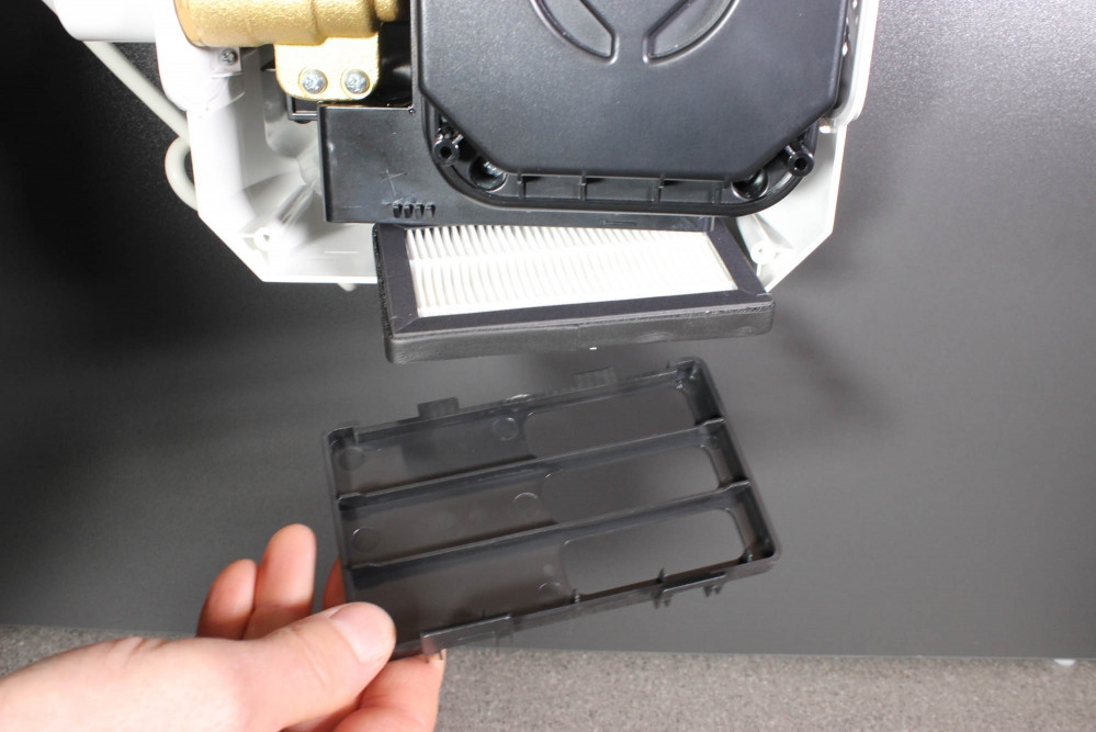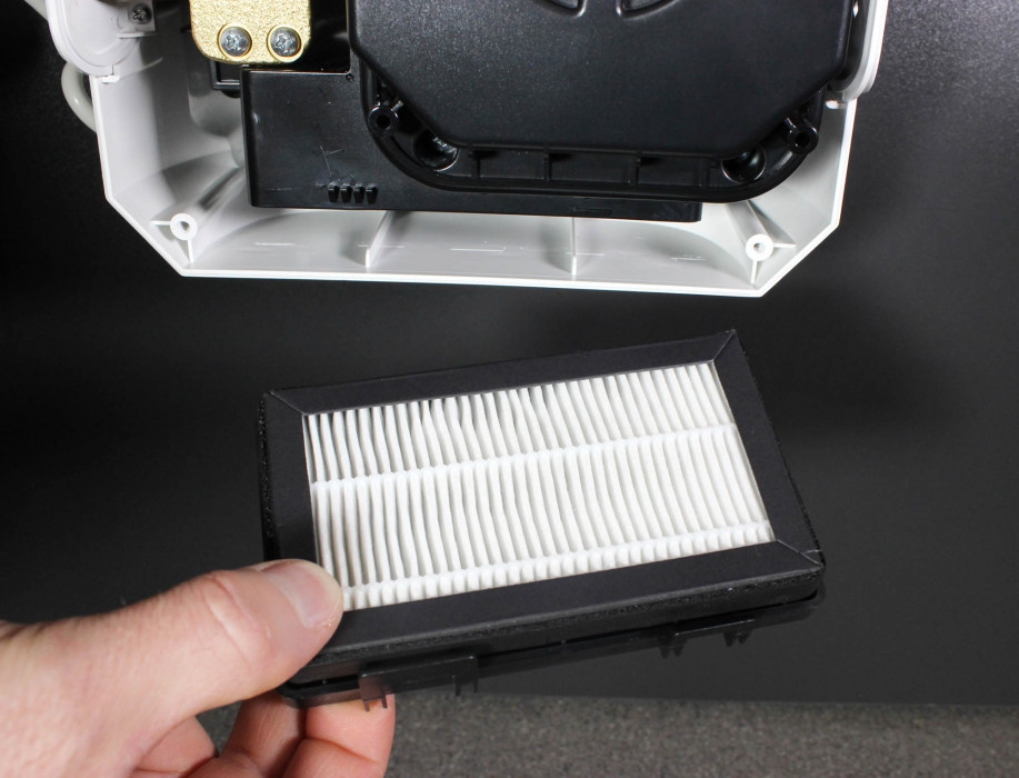 Odmontujte přední kryt motorové jednotky, ve spodní části najdete dvě jistící západky krytu HEPA filtru.  Vycvakněte západky a sundejte kryt, uchopte a vysuňte HEPA filtr z přístroje. Vyjměte HEPA filtr, zasuňte HEPA filtr zpět na místo a nasaďtě kryt, obě západky musí zacvaknout na místo. Namontujte zpět přední kryt motorové jednotky.