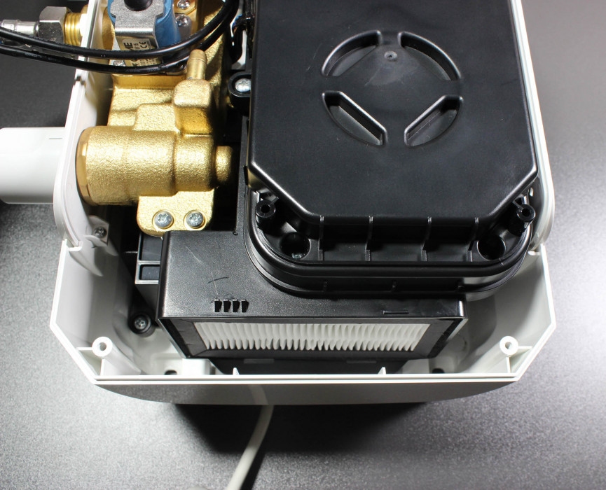 HEPA filtr umístěte zpět do přístroje gumovým černým těsněním směrem nahoru. Filtr vložte zpět do šuplíku. Následně zasuňte šuplík s HEPA filtrem zpět do přístroje.