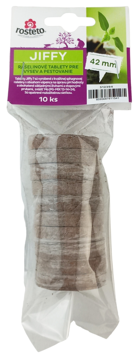Jiffy jsou vyrobeny z kvalitní rašeliny s obsahem vápence a obohaceny základními živninami. Jsou opatřeny rozložitelnou síťkou, která drží tvar po nabobtnání. Používají se k řízkování, pikýrování a množení např. jahod. Balení obsahuje 10 ks.