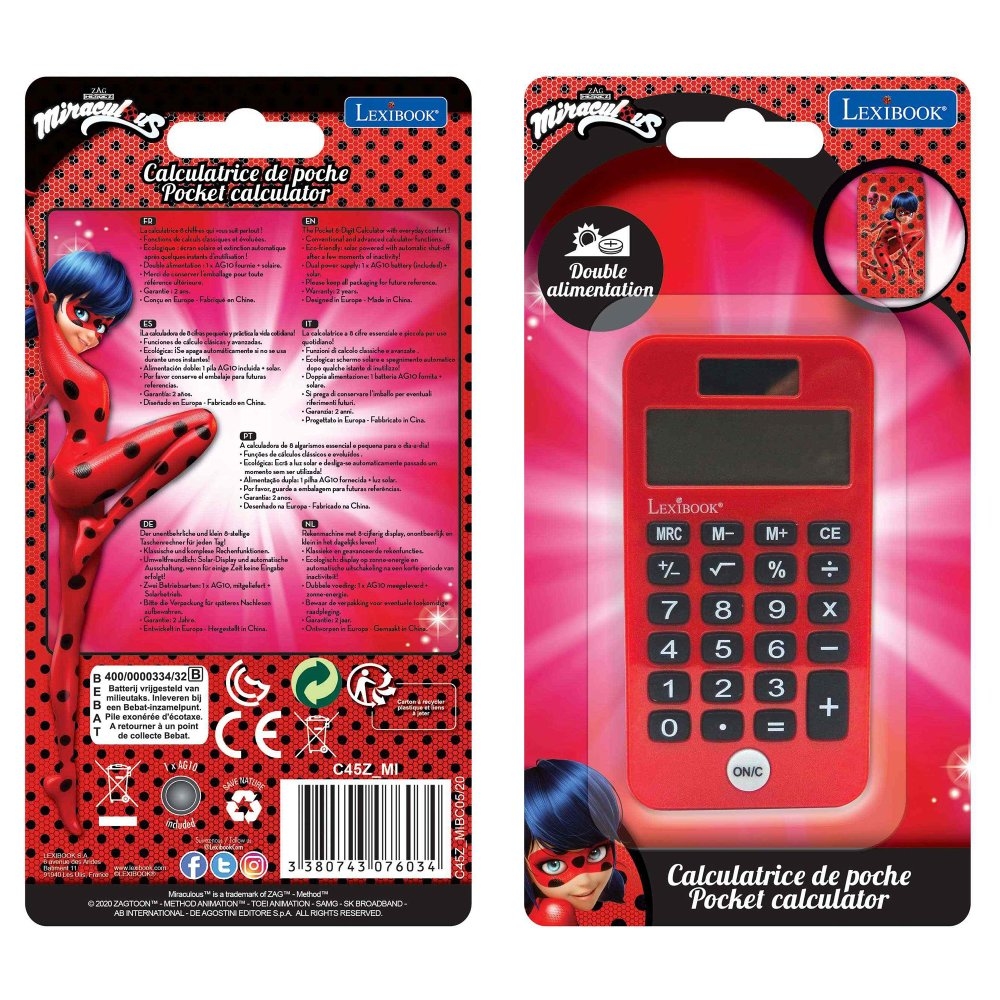 Praktická osmimístná kalkulačka, kterou si můžete vzít kamkoli s sebou díky kompaktnímu designu a duálnímu napájení. Základní funkce a pokročilé funkce (procenta, paměť) a velký nakloněný displej s jedním displejem. Počítejte se svými oblíbenými hrdiny! Lehká, malá a s ochranným krytem. Běžné i pokročilé funkce kalkulačky Šetrná k životnímu prostředí: solární napájení s automatickým vypnutím po chvíli nečinnosti. Duální napájení: 1 x baterie AG10 (součástí balení) a solární napájení. Rozměry: 11,6 x 6,3 x 1,2 cm