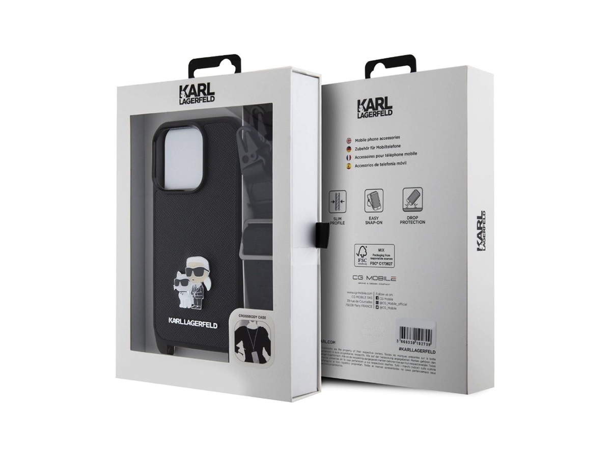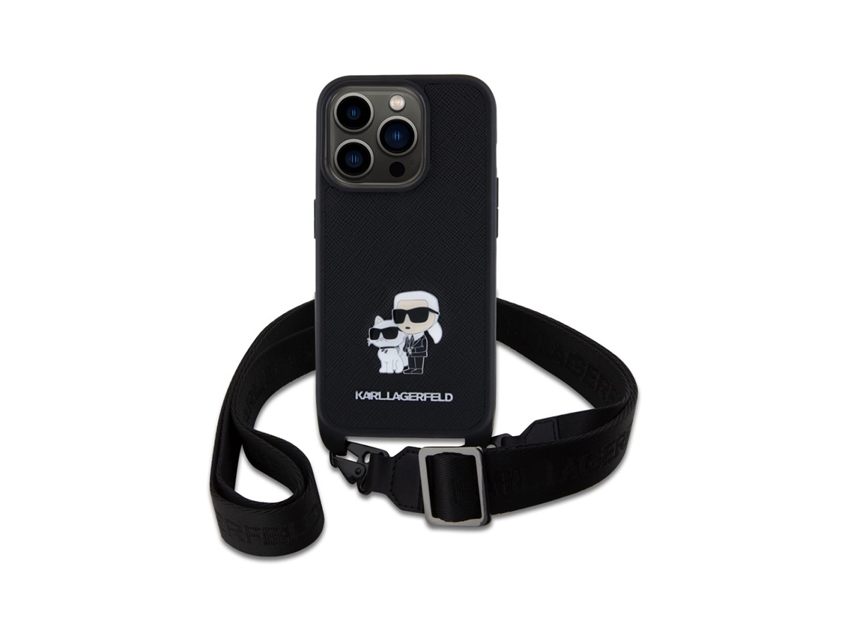 Karl Lagerfeld Saffiano Crossbody Popruh Metal Karl and Choupette Zadní Kryt pro iPhone 15 Pro Černá