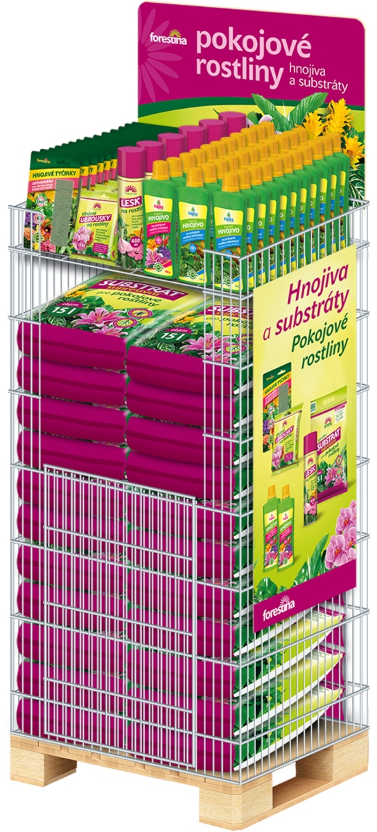 Drátěný koš umístěný na paletě pro efektivní prezentaci hnojiv a substrátů Forestina.