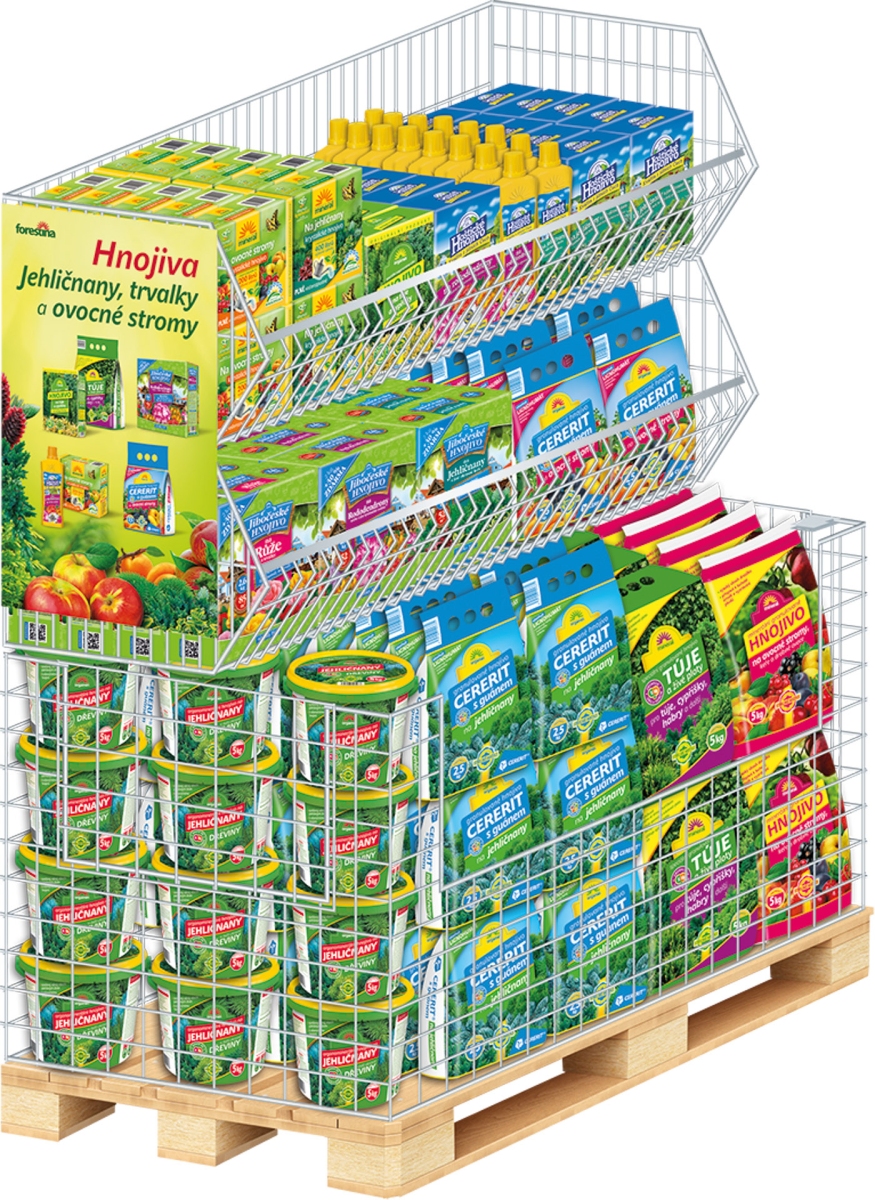 Drátěná klec umístěná na paletě pro efektivní prezentaci hnojiv a substrátů Forestina.