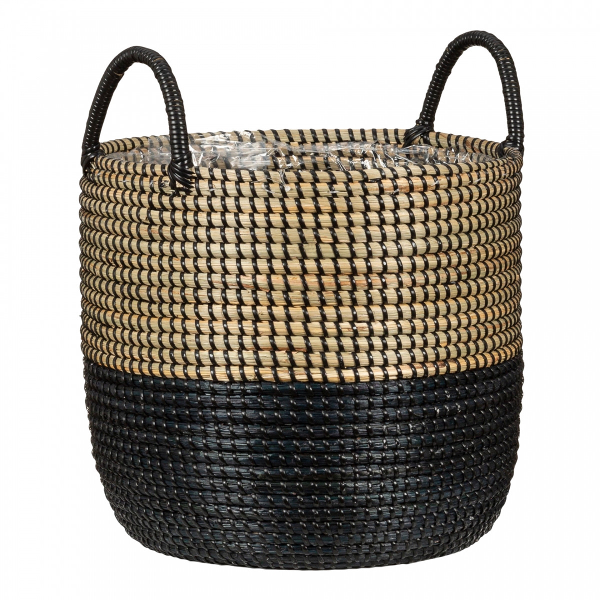 Klasický dvoubarevný proutěný květináč z mořské trávy, s držadly, uvnitř lemovaný pevnou voděodolnou fólií, do vašeho obývacího prostoru.