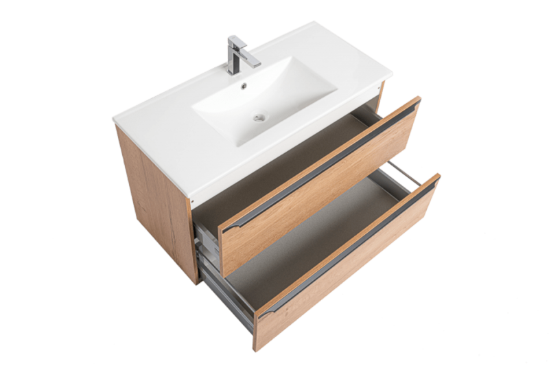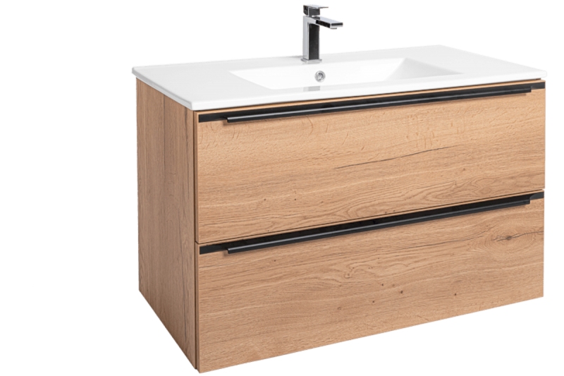 Závěsná koupelnová skříňka s keramickým umyvadlem v provedení dub Sierra o rozměru 90x60x46 cm. Povrch v provedení lamino. S plnovýsuvem a dotahem.