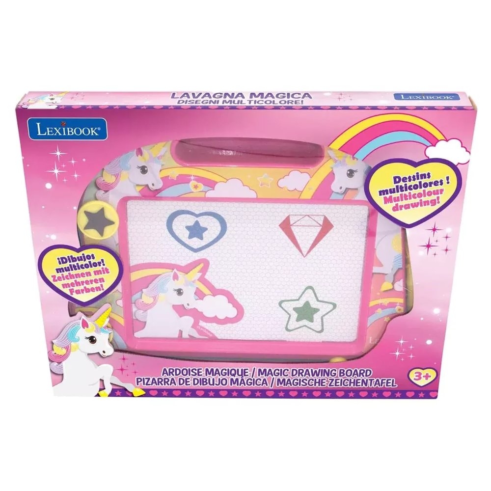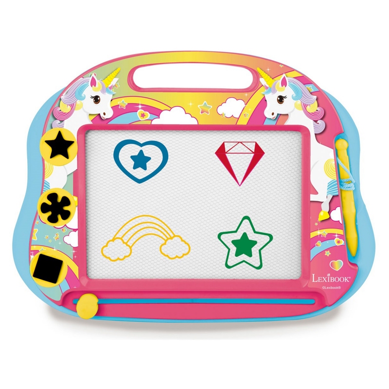 Skvělý design s Jednorožcem! Vícebarevná kresba pro hodiny zábavy s kreslením. Kreslete nebo pište pomocí přiloženého pera a razítek a jednoduše pomocí posuvné gumy začněte znovu! V balení 1 magnetické pero. 3 magnetická razítka pro přidání vzorů do vašich kreseb: hvězda, květina, čtverec. Pohodlná rukojeť pro snadné držení! Pro děti od 3 let. Záruka: 2 roky Navrženo a vyvinuto v Evropě - vyrobeno v Číně