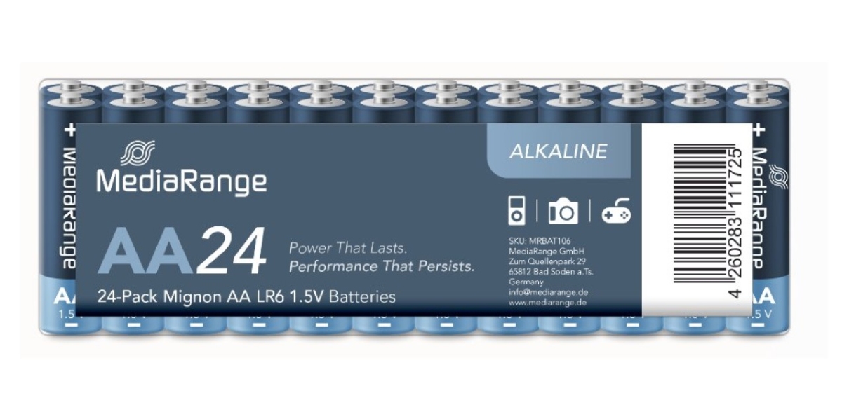 MediaRange Premium Alkaline AA (LR6) 1,5V jsou výkonné alkalické baterie určené pro zařízení s vyšší spotřebou energie a nepřetržitým provozem. Moderní alkalická technologie zajišťuje stabilní napětí, dlouhou výdrž a spolehlivý výkon pro fotoaparáty, hračky, svítilny, ovladače či další běžnou elektroniku. Bez kadmia a rtuti. PN: MRBAT106
