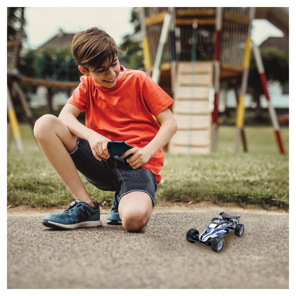 Mini bugina Crosslander® o velikosti 16 cm je připravena na bláznivé závody. Dosahuje rychlosti až 15 km/h a má realistický design v měřítku 1:28. Bugina je řízena dálkovým ovládáním ve všech směrech na frekvenci 2,4 GHz, což zajišťuje plynulé manévrování.Auto funguje na dobíjecí baterií (součástí balení) a nabízí 18 minut herní zábavy. Přiložený USB kabel umožňuje snadné dobití. Do dálkového ovládání jsou potřeba dvě AA baterie (nejsou součástí balení).Hračky tohoto typu přinášejí dětem spoustu zábavy, vzrušení a dobrodružství. Podporují jejich motorické dovednosti a obohacují hru.Klíčové vlastnostiMini bugina Crosslander® na dálkové ovládáníZávodní auto s rychlostí až 15 km/hDélka auta: 16 cm; v měřítku 1:28Hladká jízda na různém povrchuIntuitivní dálkové ovládání na frekvenci 2,4 GHz pro plynulý provozVhodné pro děti od 5 letDobíjecí baterie součástí balení, včetně nabíjecího kabeluDálkové ovládání funguje na dvě AA baterie (nejsou součástí balení)