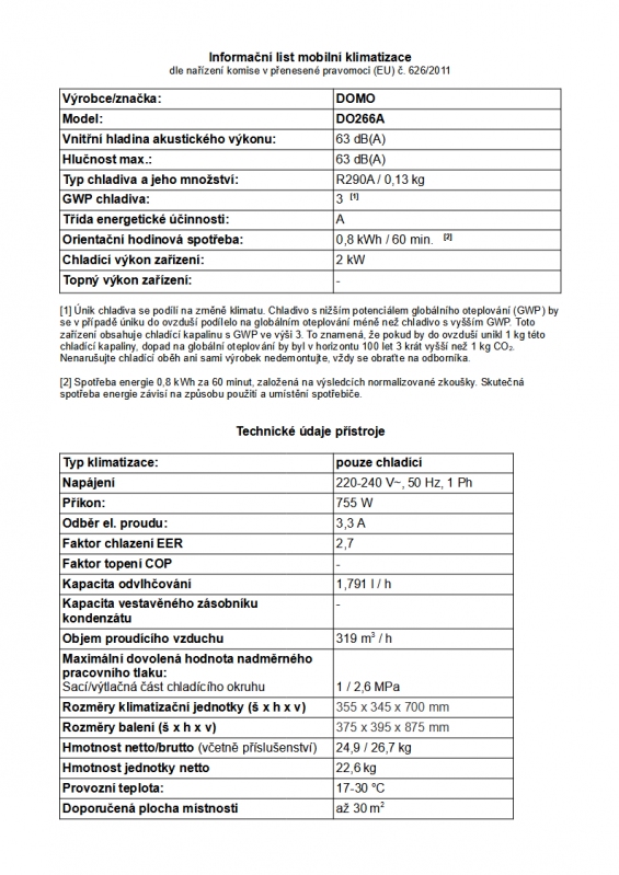 Mobilní klimatizace 7000 BTU - DOMO DO266A