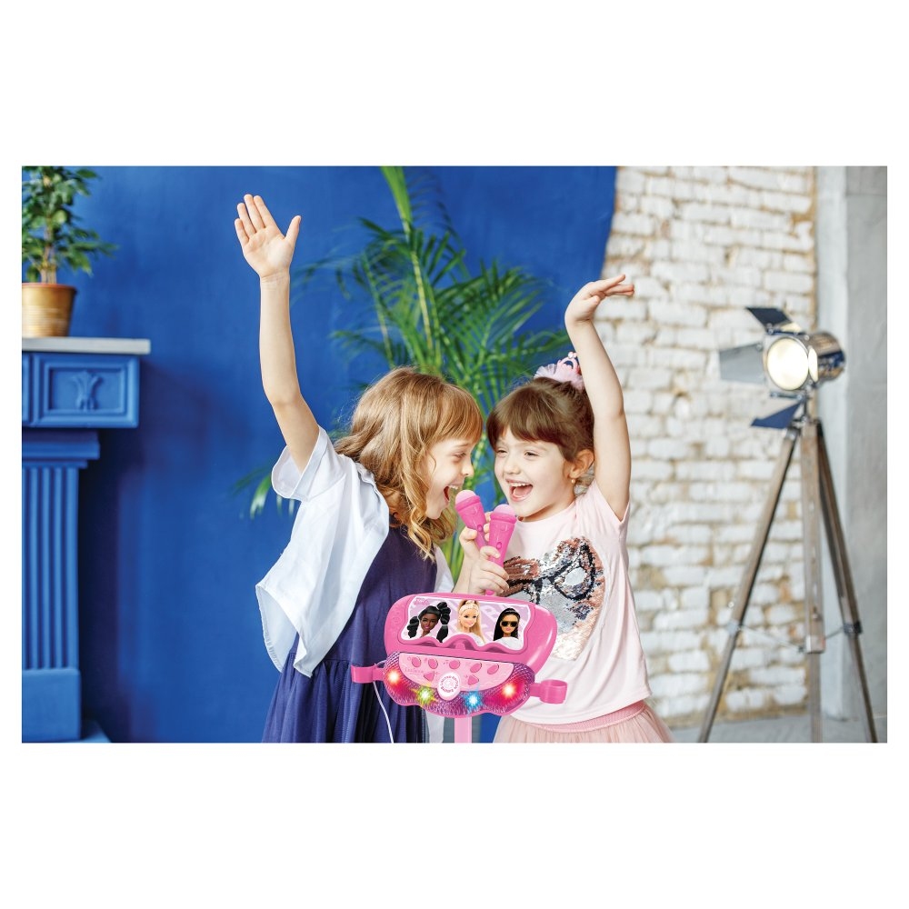 Barbie již více než 60 let baví a inspiruje celé generace! Chtějí se vaši malí fanoušci také stát součástí tohoto růžového, luxusního světa? S jejími módními oblečky, krásnými doplňky a luxusním životním stylem není překvapením, proč jsou děti touto okouzlující postavičkou a jejími přáteli fascinovány. Nechte své děti snít ve velkém a pomozte jim vyjádřit jejich kreativitu, představivost a sebevědomí po boku nejikoničtějšího vzoru moderní doby! Potěšte své děti tímto zábavným stojanem se dvěma dětskými mikrofony. Hrajte jejich oblíbené písničky a dopřejte jim pocit opravdových hudebních hvězd na jevišti. Stačí otevřít držák na telefon a pomocí 3,5mm Aux-in kabelu (součástí balení) připojte smartphone nebo jiné audio zařízení. Děti mohou zpívat sólo nebo vytvořit duet. Vícebarevné světelné efekty na reproduktoru, které děti doprovází při zpěvu, vytvářejí úžasnou hudební atmosféru. Na reproduktoru lze přehrávat ukázkové melodie nebo nahrát 60sekundový zvukový záznam vystoupení na mikrofon. S nastavitelnou výškou od 60 do 95 cm si děti stojan snadno přizpůsobí podle svých potřeb. Součástí je držák na telefon, který dětem umožní pořizovat fotografie a videa během vystoupení nebo číst texty písní při karaoke.   Reproduktor je napájen třemi 1,5 V bateriemi typu AA/LR6 (nejsou součástí balení), takže si děti mohou vzít hudbu kamkoliv s sebou bez nutnosti zásuvky. Přihrádku na baterie otevřete pomocí šroubováku (není součástí balení). Podpora dětí v jejich oblíbených aktivitách je výborný způsob, jak posílit jejich sebevědomí. Zpívání pomáhá vyjádřit emoce, zlepšuje náladu a posiluje společenské vazby. Zároveň je to skvělá činnost, která přináší radost celé rodině a vytváří spoustu nezapomenutelných zážitků. Klíčové vlastnosti Téma Barbie Nastavitelný stojan s reproduktorem a 2 dětskými mikrofony Ideální pro všechny děti, které rády tancují a zpívají Skvělá zábava pro sourozence nebo kamarády Dopřejte dětem pocit opravdových hudebních hvězd na jevišti Pomocí 3,5mm Aux-in kabelu (součástí balení) připojte vlastní smartphone nebo jiné audio zařízení (nejsou součástí balení) a hrajte oblíbené písničky svých dětí Světelné efekty na reproduktoru vytvářejí skvělou hudební atmosféru během zpívání Výška stojanu je nastavitelná (v rozmezí 60 až 95 cm), aby vyhovovala každému hudebníkovi Držák na telefon, který umožní pořizovat fotografie a videa během vystoupení nebo číst texty písní 6 ukázkových skladeb a melodií Možnost nahrát 60sekundový pěvecký výkon přímo na mikrofon Nastavitelná hlasitost a možnost přepínat mezi další a předchozí skladbou 2 mikrofony pro vytvoření pěveckého dua Napájení: 3 x 1,5 V baterie AA/LR6 (nejsou součástí balení), přihrádku na baterie otevřete pomocí šroubováku (není součástí balení)