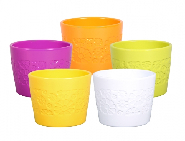 Lesklý keramický obal na květník je určen pro interiér. Je 100% voděodolný, glazovaný. Průměr: 11 cm, výška: 10 cm. Mix barev: oranžová, růžová, zelená, bílá, žlutá.