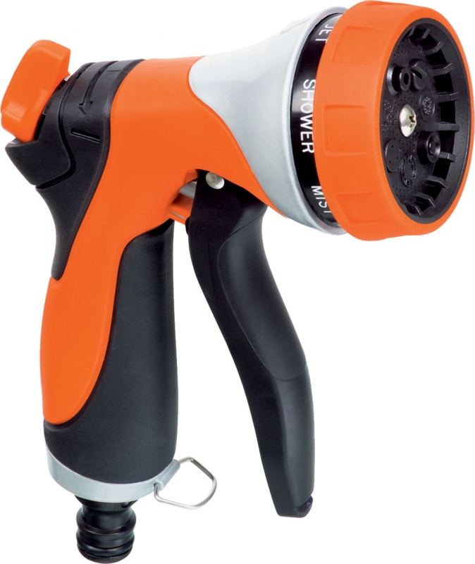 Víceúčelová postřikovací kovová pistole s ergonomickým držadlem, se sedmi druhy nastavení rozstřiku (sprcha, perlátor, mlžítko, proud atd.). S regulací přítoku vody se skvělým designem a funkční zdatností. Baleno v blistru.