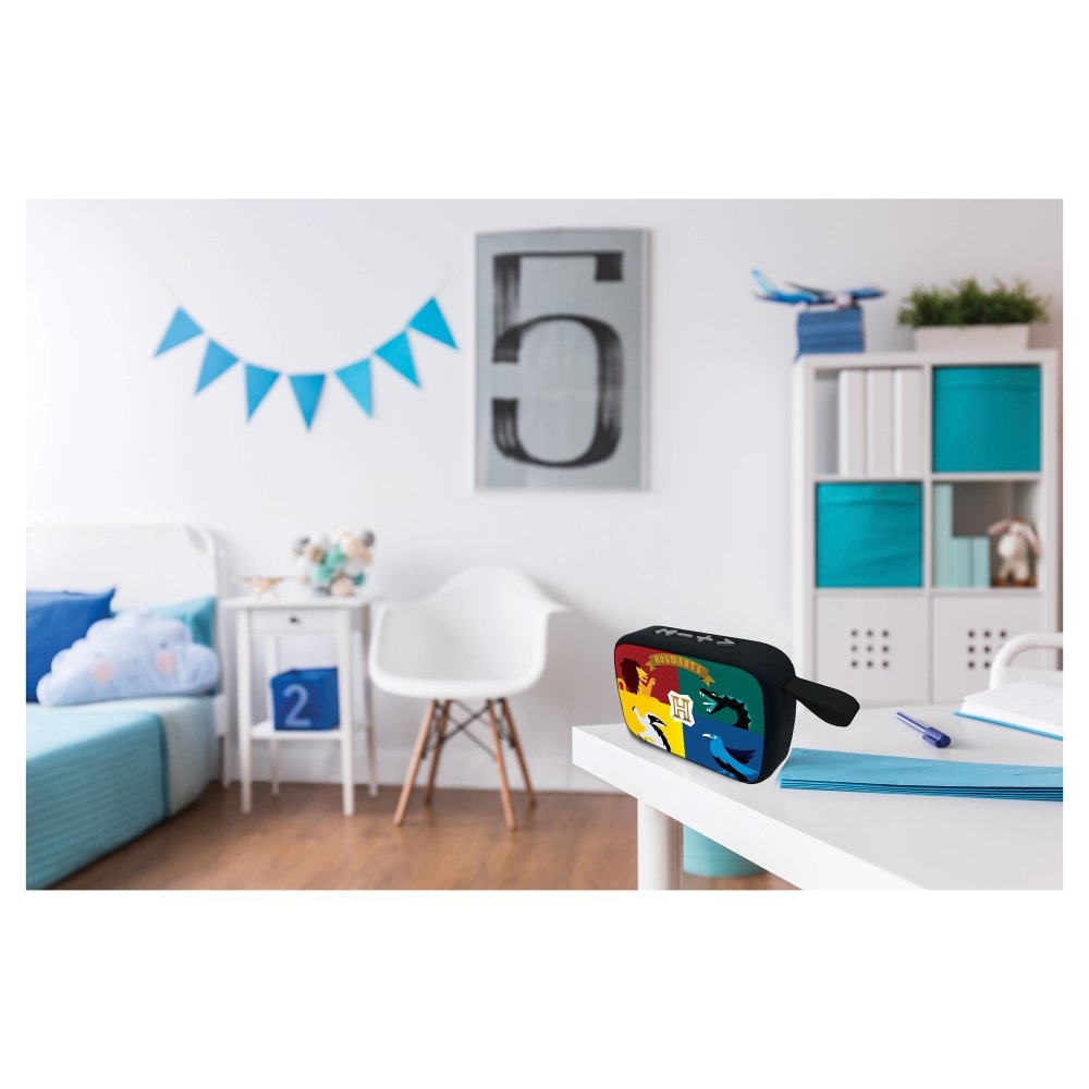 Přenosný reproduktor s motivy Harryho Pottera v elegantním designu lze díky technologii Bluetooth připojit k audio zařízením, telefonům nebo tabletům. Funkce TWS navíc umožní synchronizaci dvou reproduktorů pro dokonalý stereo zvuk. Látková povrchová úprava příjemná na dotek. Jednoduché ovládání pomocí tlačítek. Praktické poutko na přenášení. Reproduktor je vybaven USB portem a slotem pro micro SD kartu. Napájení přes integrovanou nabíjecí baterii – kabel na dobíjení je součástí dodávky. Pro děti od 6 let.