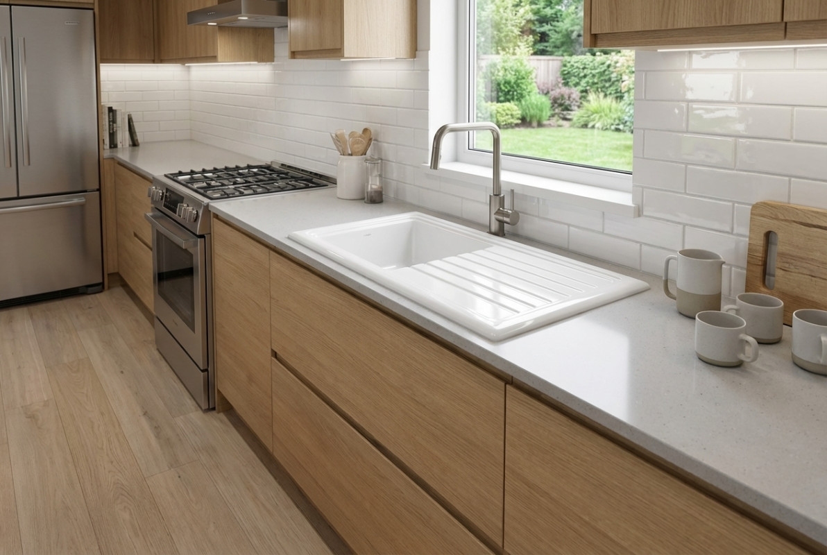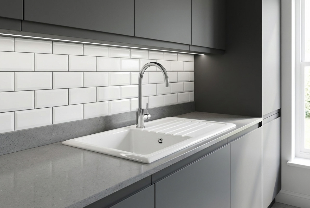 - zářivě bílý keramický dřez ve vysokém lesku s odkapávačem