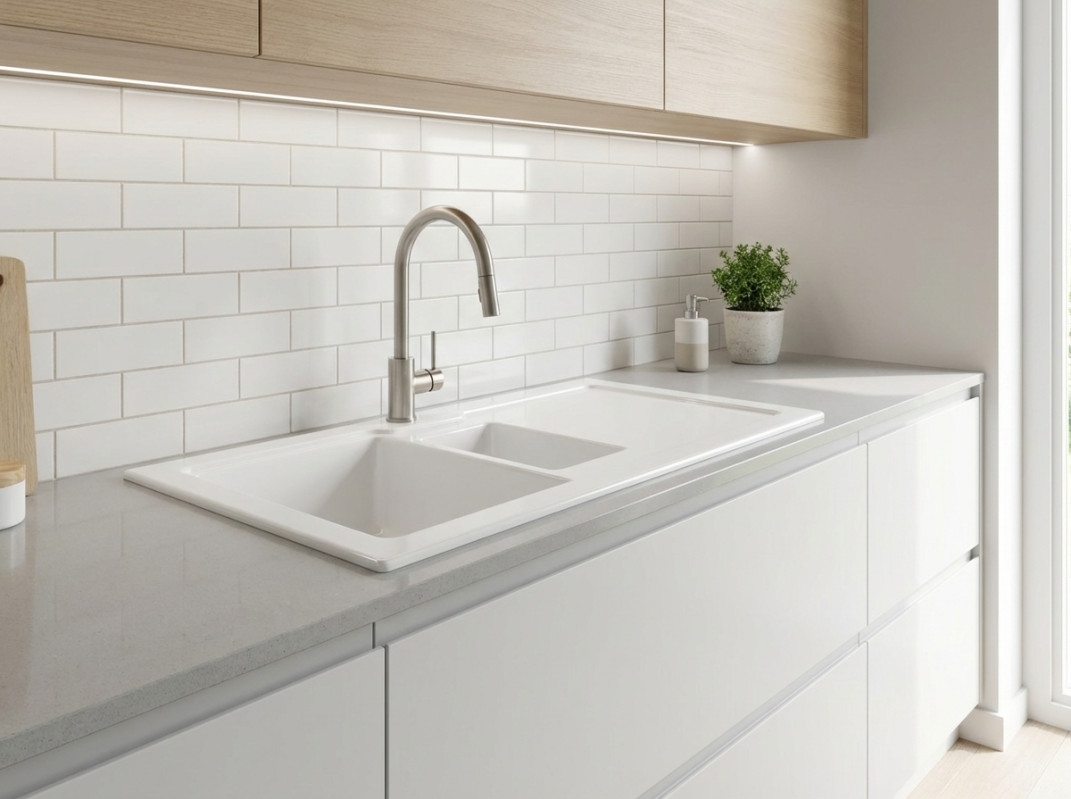 • zářivě bílý keramický dřez ve vysokém lesku s odkapávačem