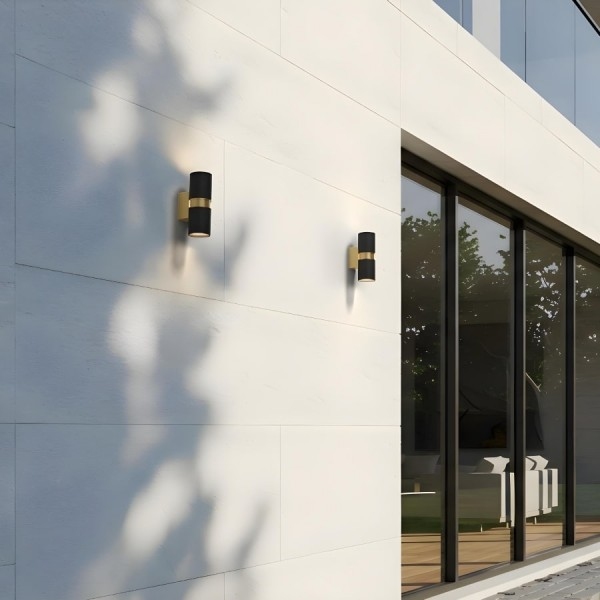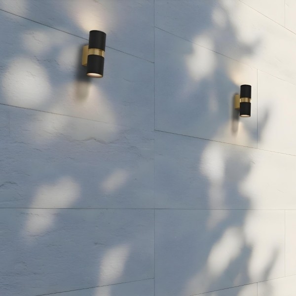 Moderní venkovní nástěnné svítidlo v elegantní kombinaci černě lakovaného kovu a česané mosazi. Určeno pro dvě LED žárovky s paticí GU10 (doporučený zdroj: G11841). Díky krytí IP54 je vhodné pro venkovní použití – odolné proti prachu a stříkající vodě.