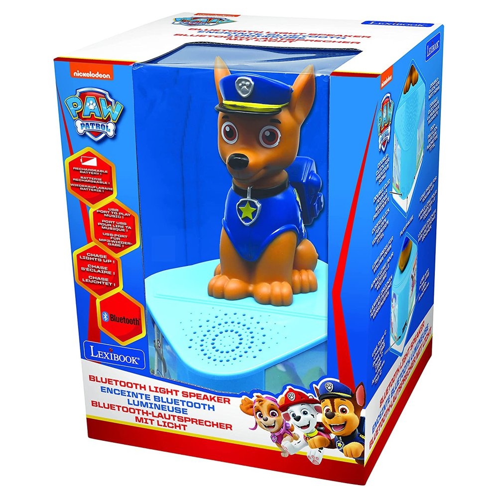 Bezdrátový reproduktor Bluetooth v kouzelném designu Tlapkové Patroly Postavička Chase svítí v rytmu hudby Lehký a snadno přenosný Kompatibilní se všemi zařízeními s funkcí Bluetooth 5.0 Obsahuje port USB pro přehrávání disků USB MP3 Funguje na dobíjecí baterii, kabel USB typu C je součástí balení Obsahuje Lithium baterii 800 mAh