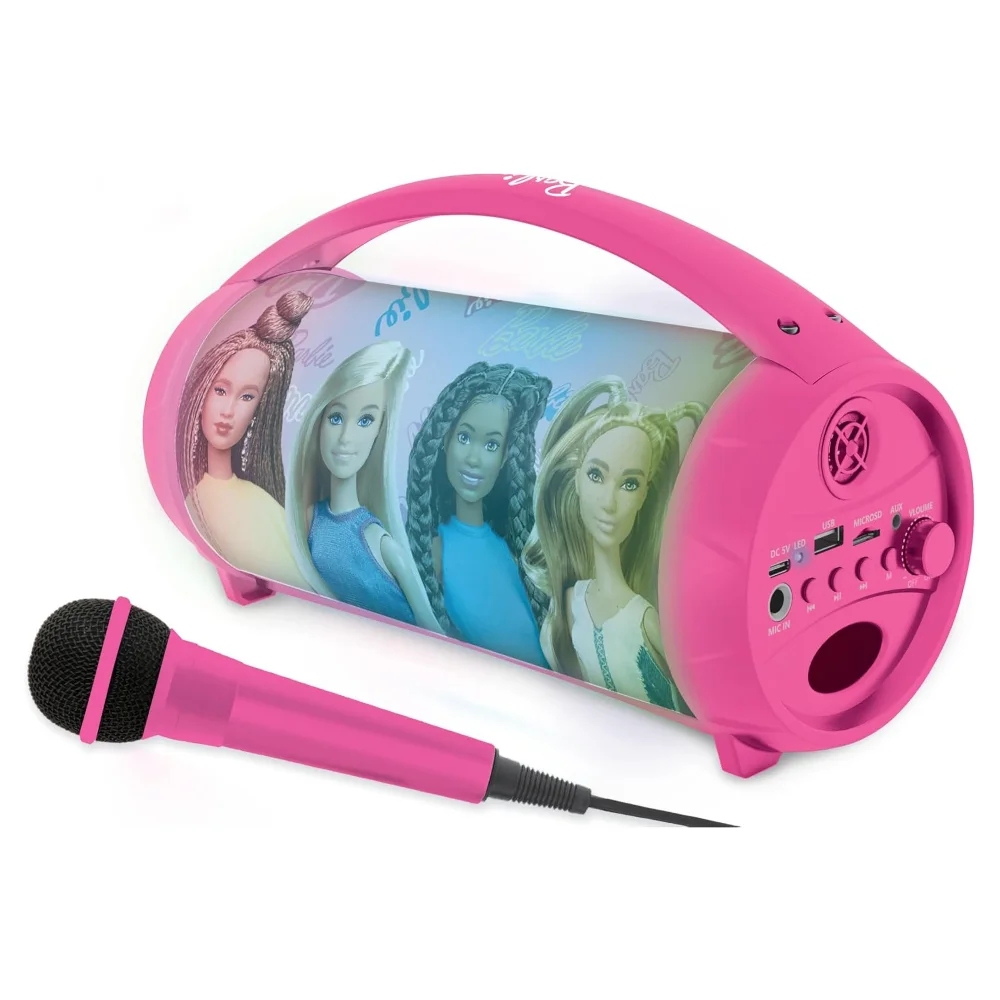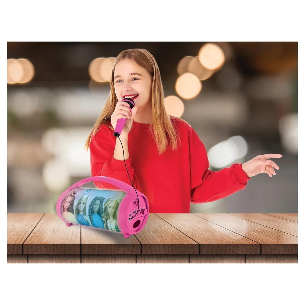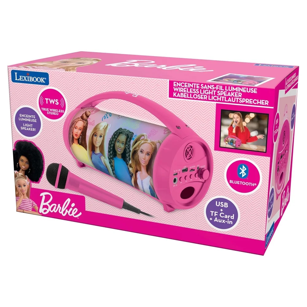 Dětský karaoke reproduktor s vícebarevnými světelnými efekty a mikrofonem je ideální pro dětskou karaoke zábavu. Bezdrátově se připojí k zařízením s Bluetooth® 5.0, jako je smartphone nebo tablet. Díky dobíjecí baterii a praktické rukojeti můžete reproduktor snadno přenášet a užívat si hudební atmosféru až 3 hodiny. Hudbu lze přehrávat také díky USB portu, Aux-in vstupu (kabel je součástí balení) nebo slotu pro SD/TF karty do 32 GB (USB disk ani karty nejsou součástí balení). Funkce TWS umožňuje synchronizaci dvou reproduktorů pro dokonalý stereo zvuk (druhý reproduktor není součástí balení).Vestavěnou dobíjecí baterii nabijete pomocí USB kabelu typu C (součástí balení).Reproduktor s barevnými světelnými efekty přináší nespočet možností pro zábavu i relaxaci. Můžete vytvořit neopakovatelnou atmosféru na dětských narozeninových oslavách nebo karaoke párty.Klíčové vlastnostiSvítící reproduktor Boombox Barbie s mikrofonemVícebarevné světelné efektyPerfektní pro dětská karaoke vystoupení nebo poslech audio pohádek před usnutímBluetooth 5.0 pro snadné připojení (k smartphonu nebo tabletu, nejsou součástí balení)3,5mm jack Aux-in (kabel součástí balení), USB port a slot pro SD/TF karty do 32 GB (USB disk ani karty nejsou součástí balení)Výdrž baterie: až 3 hodinyPraktická rukojeť na přenášeníSystém True Wireless Stereo (TWS): synchronizace 2 reproduktorů stejného modelu pro stereo zvuk (druhý reproduktor není součástí balení)Napájení: vestavěná dobíjecí baterie (1200 mAh) s USB-C nabíjením (kabel součástí balení)Přibližné rozměry: 27,6 x 11,7 x 15,5 cm