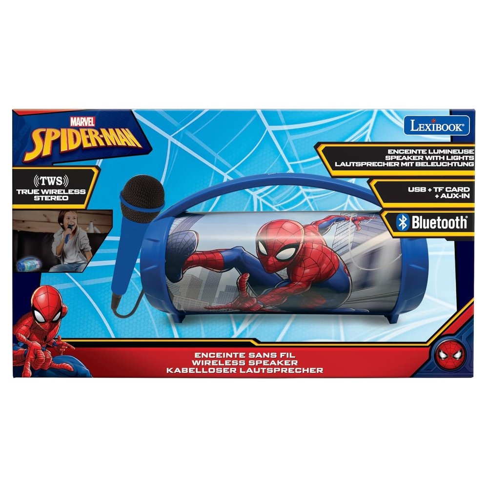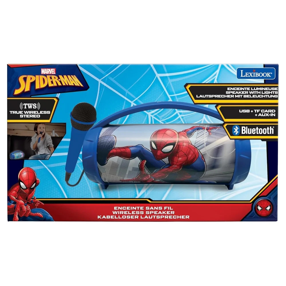 Dětský karaoke reproduktor s vícebarevnými světelnými efekty a mikrofonem je ideální pro dětskou karaoke zábavu. Bezdrátově se připojí k zařízením s Bluetooth® 5.0, jako je smartphone nebo tablet. Díky dobíjecí baterii a praktické rukojeti můžete reproduktor snadno přenášet a užívat si hudební atmosféru až 3 hodiny. Hudbu lze přehrávat také díky USB portu, Aux-in vstupu (kabel je součástí balení) nebo slotu pro SD/TF karty do 32 GB (USB disk ani karty nejsou součástí balení). Funkce TWS umožňuje synchronizaci dvou reproduktorů pro dokonalý stereo zvuk (druhý reproduktor není součástí balení).Vestavěnou dobíjecí baterii nabijete pomocí USB kabelu typu C (součástí balení).Reproduktor s barevnými světelnými efekty přináší nespočet možností pro zábavu i relaxaci. Můžete vytvořit neopakovatelnou atmosféru na dětských narozeninových oslavách nebo karaoke párty.Klíčové vlastnostiSvítící reproduktor Boombox Spider-Man s mikrofonemVícebarevné světelné efektyPerfektní pro dětská karaoke vystoupení nebo poslech audio pohádek před usnutímBluetooth 5.0 pro snadné připojení (k smartphonu nebo tabletu, nejsou součástí balení)3,5mm jack Aux-in (kabel součástí balení), USB port a slot pro SD/TF karty do 32 GB (USB disk ani karty nejsou součástí balení)Výdrž baterie: až 3 hodinyPraktická rukojeť na přenášeníSystém True Wireless Stereo (TWS): synchronizace 2 reproduktorů stejného modelu pro stereo zvuk (druhý reproduktor není součástí balení)Napájení: vestavěná dobíjecí baterie (1200 mAh) s USB-C nabíjením (kabel součástí balení)Přibližné rozměry: 27,6 x 11,7 x 15,5 cm