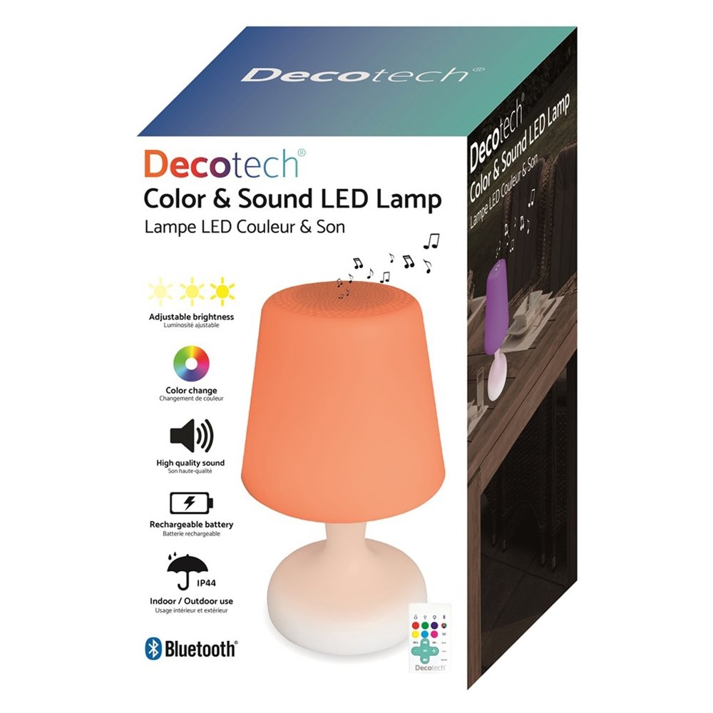 Bluetooth® reproduktor 8 W. Dálkovým ovladačem vybíráte intenzitu světla a nekonečný počet barev. Různé světelné efekty včetně diskotékového režimu: lampa sleduje váš hudební rytmus! Vestavěná dobíjecí baterie 2 000 mAh! Výdrž baterie až 6 hodin! Odolnost proti vodě a prachu: IP44. Napájení: dobíjení pomocí kabelu USB (součást dodávky) + 1 baterie CR2025 (součást dodávky) pro dálkový ovladač. Rozměry: 15,6 x 15,6 x 26 cm.