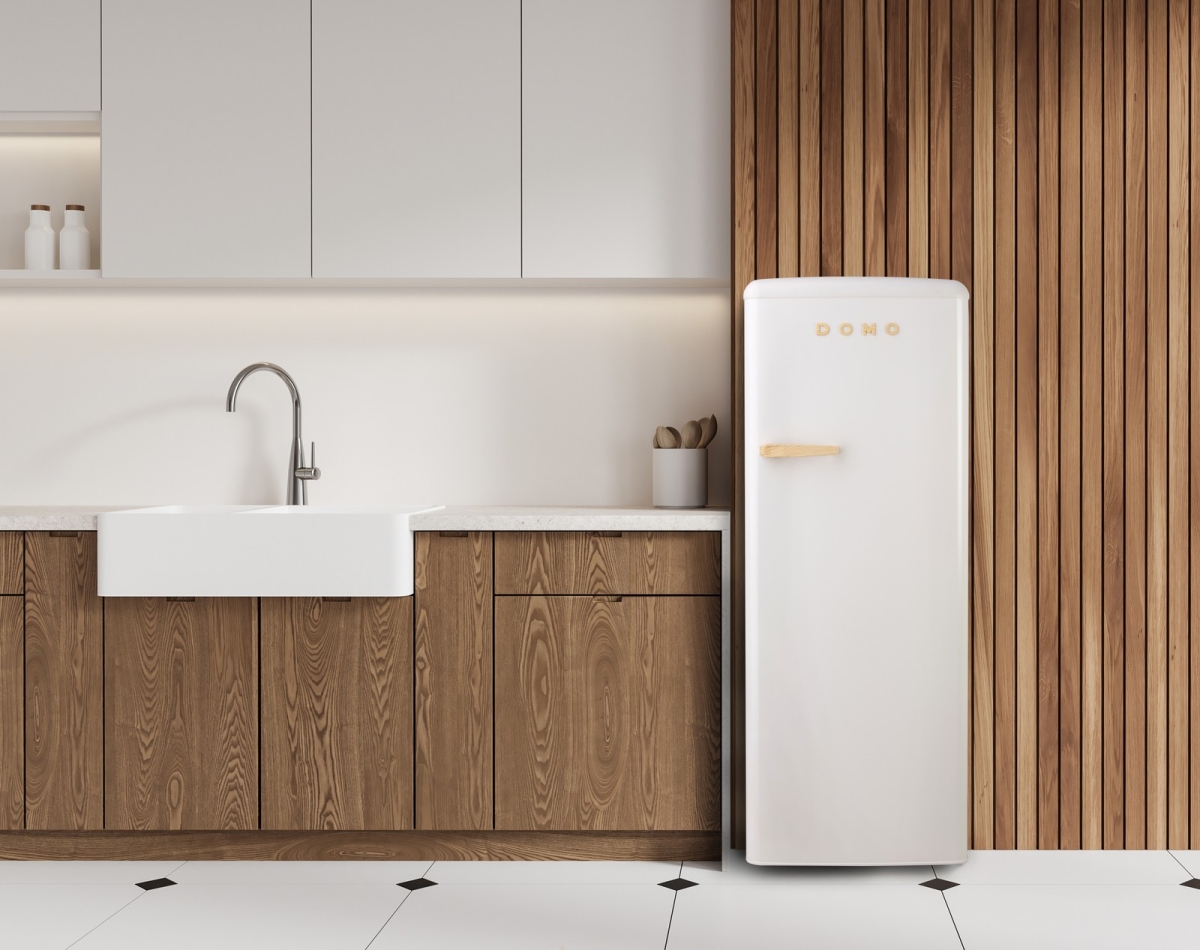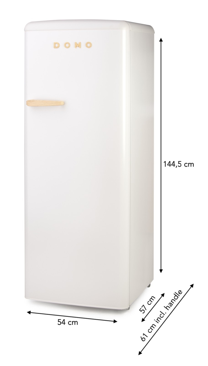 Volně stojící chladnička DOMO DO91709R dodá vaší kuchyni retro nádech. Tato elegantní retro chladnička v bílé barvě a s rukojetí ve vzhledu dřeva kombinuje design s funkčností.