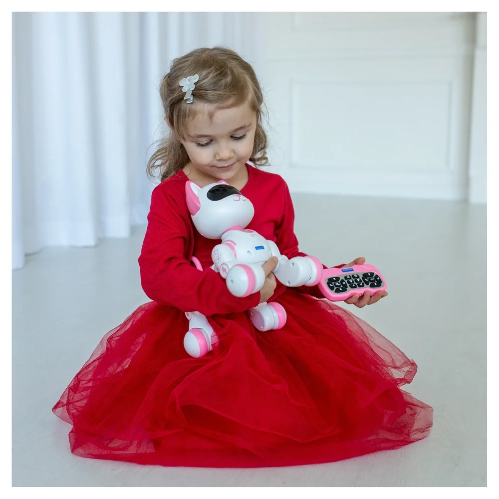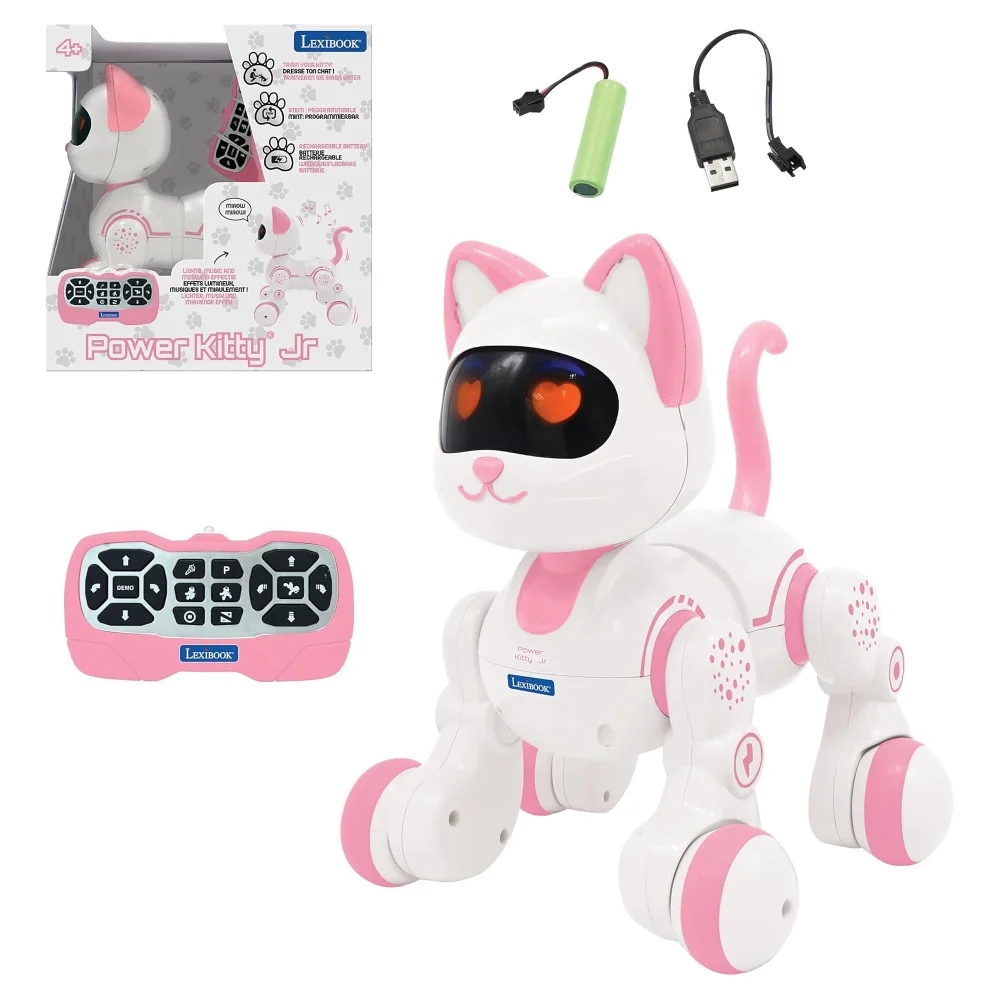 Kočičí robot pro děti se světelnými efekty v očích ve tvaru srdce se díky mechanismu pohybuje jako skutečná kočka – dokáže kličkovat, klouzat se a dokonce mňoukat. Umí chodit do všech směrů a je doplněn o zábavné zvukové efekty. Děti mohou kočce prostřednictvím ovladače zadat instrukce na taneční pohyby, které pak následuje. Nového domácího mazlíčka si děti zamilují!Power Kitty má vestavěnou dobíjecí baterii, kterou nabijete pomocí přiloženého USB nabíjecího kabelu. Do dálkového ovládání budete potřebovat dvě 1,5 V baterie typu AAA/LR03.Robotické hračky pro děti spojují fascinujícím způsobem zábavu a učení, což podporuje rozvoj kreativity a dovedností a zároveň seznamuje děti s technologiemi budoucnosti. Tyto hračky nejenom baví, ale také inspirují děti k objevování a tvoření v podnětném vzdělávacím prostředí.Klíčové vlastnostiRobotická kočka Power Kitty® JuniorNový zvířecí kamarád pro dětiPokyny jsou zadávány prostřednictvím dálkového ovládání (robot není ovládán hlasovými pokyny)Umí chodit do všech směrů, klouzat se a mňoukat jako kočkaMnoho zvukových a světelných efektů: oči ve tvaru srdíčekTréninková funkce: možnost zadávat nové tance a pokyny (robot není ovládán hlasovými pokyny, pouze dálkovým ovládáním)Napájení: robota s vestavěnou dobíjecí baterií (součástí balení) nabijete pomocí USB nabíjecího kabelu (součástí balení), dálkové ovládání funguje na dvě 1,5 V baterie typu AAA/LR03 (nejsou součástí balení, typ požadovaných baterií se může lišit)Přibližná velikost: 21 x 21 x 19 cm