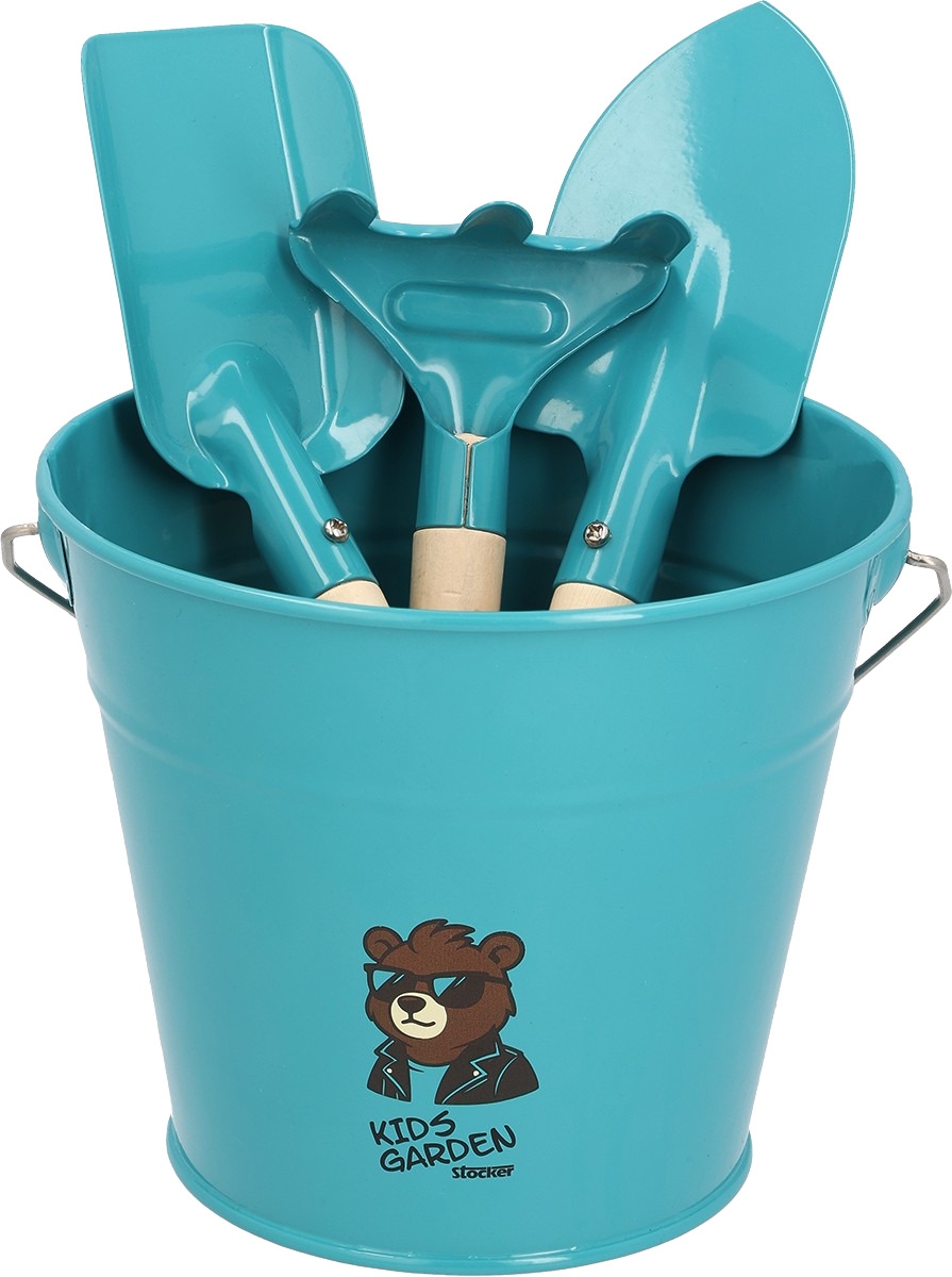 Sada dětského nářadí a kyblík v modré barvě - hrabičky, lopatička a rýč s násadou s dětskými motivy.