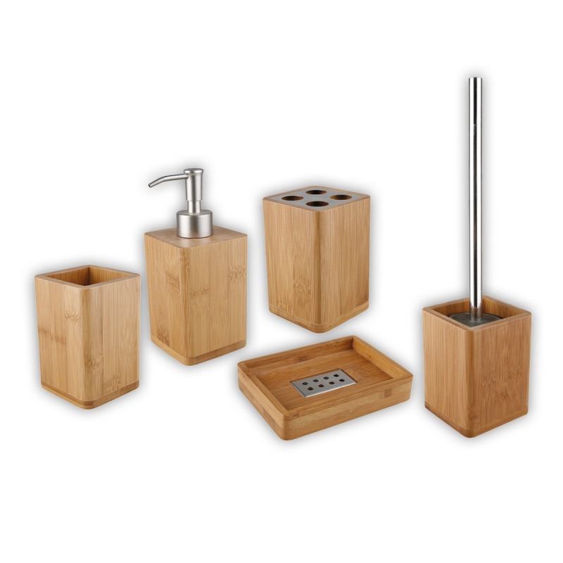 Jemná a elegantní série volně stojících koupelnových doplňků LATIA je díky své kombinaci bambusového dřeva a nerezu jasnou volbou do koupelny laděné ve světlých tónech