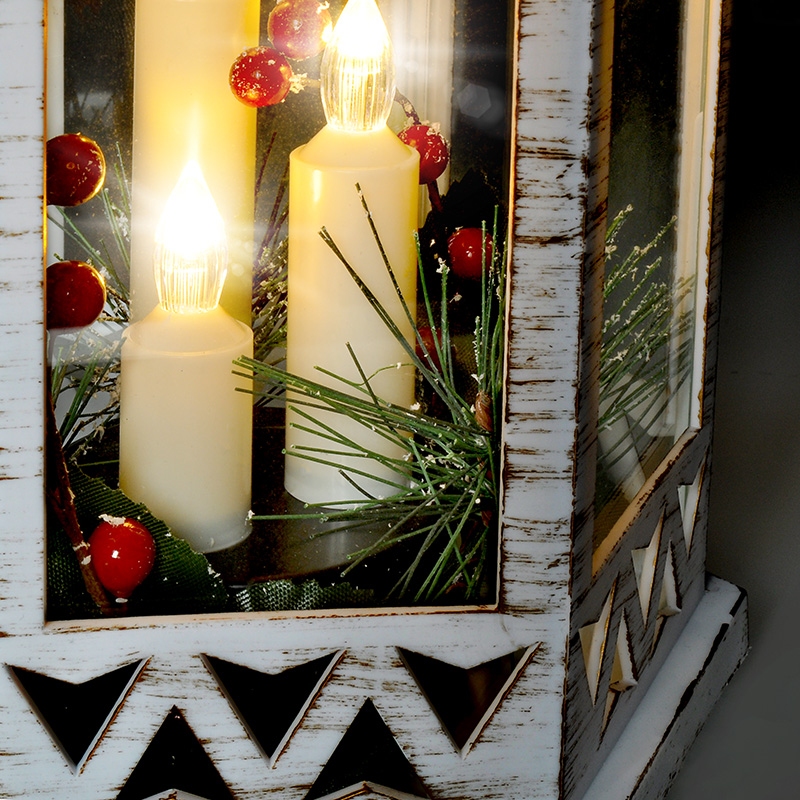 vánoční lucerna bílá s třemi LED svíčkami a dekoracemi počet LED diod: 3 počet svící: 3 barva světla: teplá bílá (žlutá) napájení: 3 x AAA baterie (nejsou součástí) výdrž baterií: cca 100hodin (v závislosti na kvalitě baterií) stupeň krytí: IP20 (vnitřní použití) rozměr: 33 x 18 x 16cm barva: bílá materiál: plast balení: barevná krabice