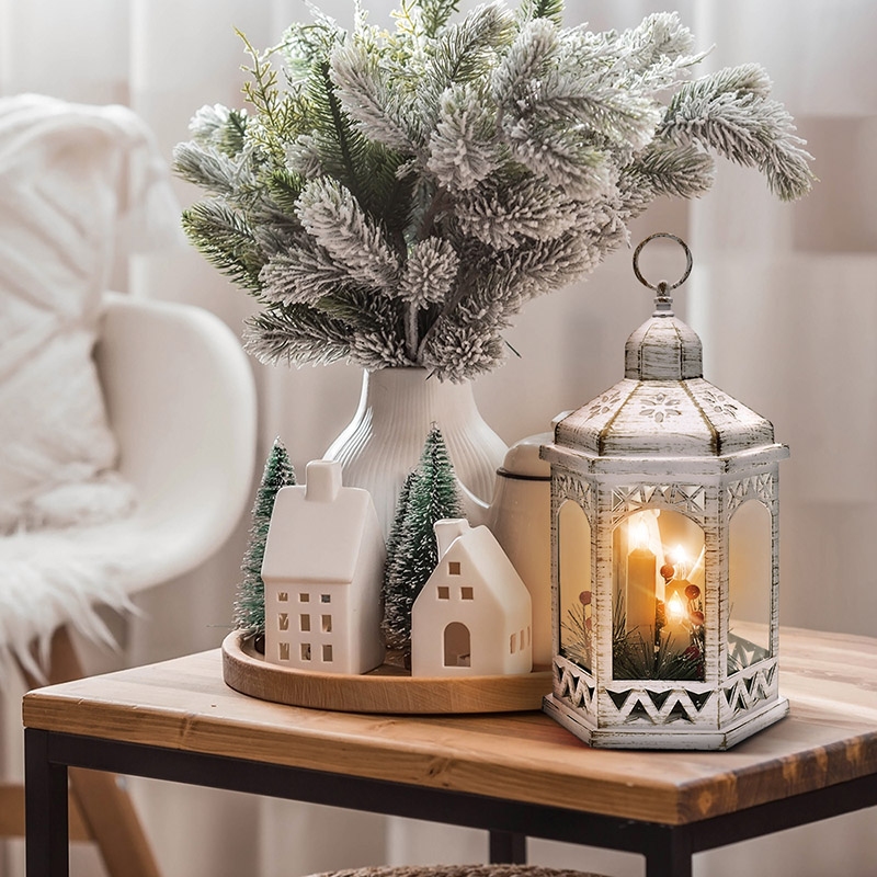 • vánoční lucerna bílá s třemi LED svíčkami a dekoracemi