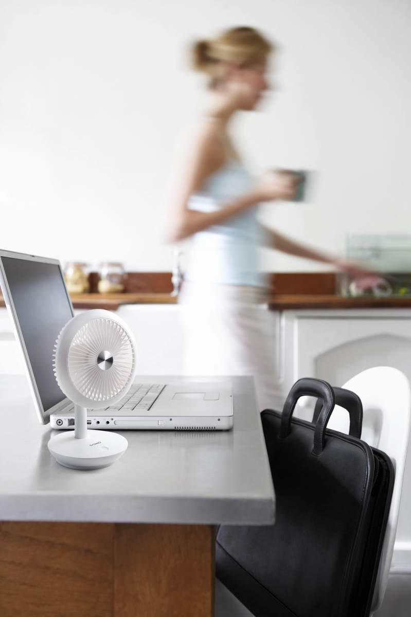 Stolní USB ventilátor v čistě bílé barvě s možností použití i bez kabelu díky vestavěného dobíjecímu akumulátoru. Na plně nabitý akumulátor můžete ventilátor používat až 15 hodin. Pokud nemáte rádi průvan z větráčku ventilátoru, ale chcete si zpříjemnit klima na svém pracovním místě, můžete snadno nastavit ventilátor na foukání přímo do stropu a zlepšit tak cirkulaci chladného vzduchu ve vaší blízkosti.