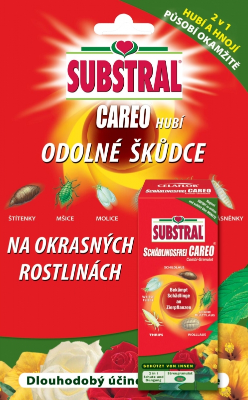 Careo koncentrát proti škůdcům účinkuje proti savým a žravým škůdcům ( molicím, štítenkám, housenkám, mšicím, červcům ) na okrasných rostlinách.
