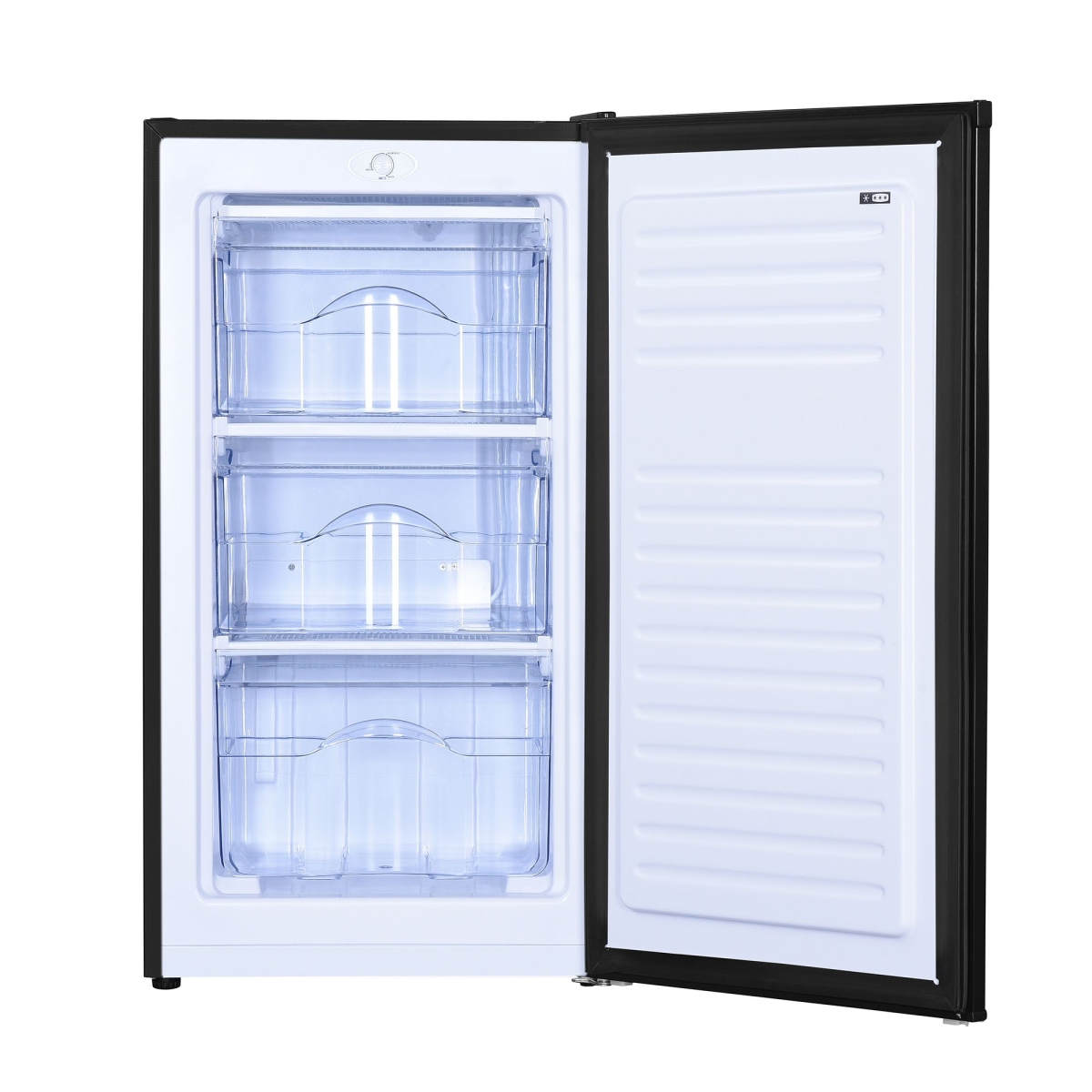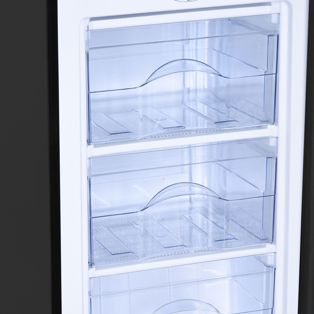 Volně stojící šuplíkový mrazák o objemu 64 l. Energetická třída D se spotřebou 126 kWh/rok. Černá barva. Kompaktní rozměry s výškou do 85 cm. Panty dveří lze přehodit.