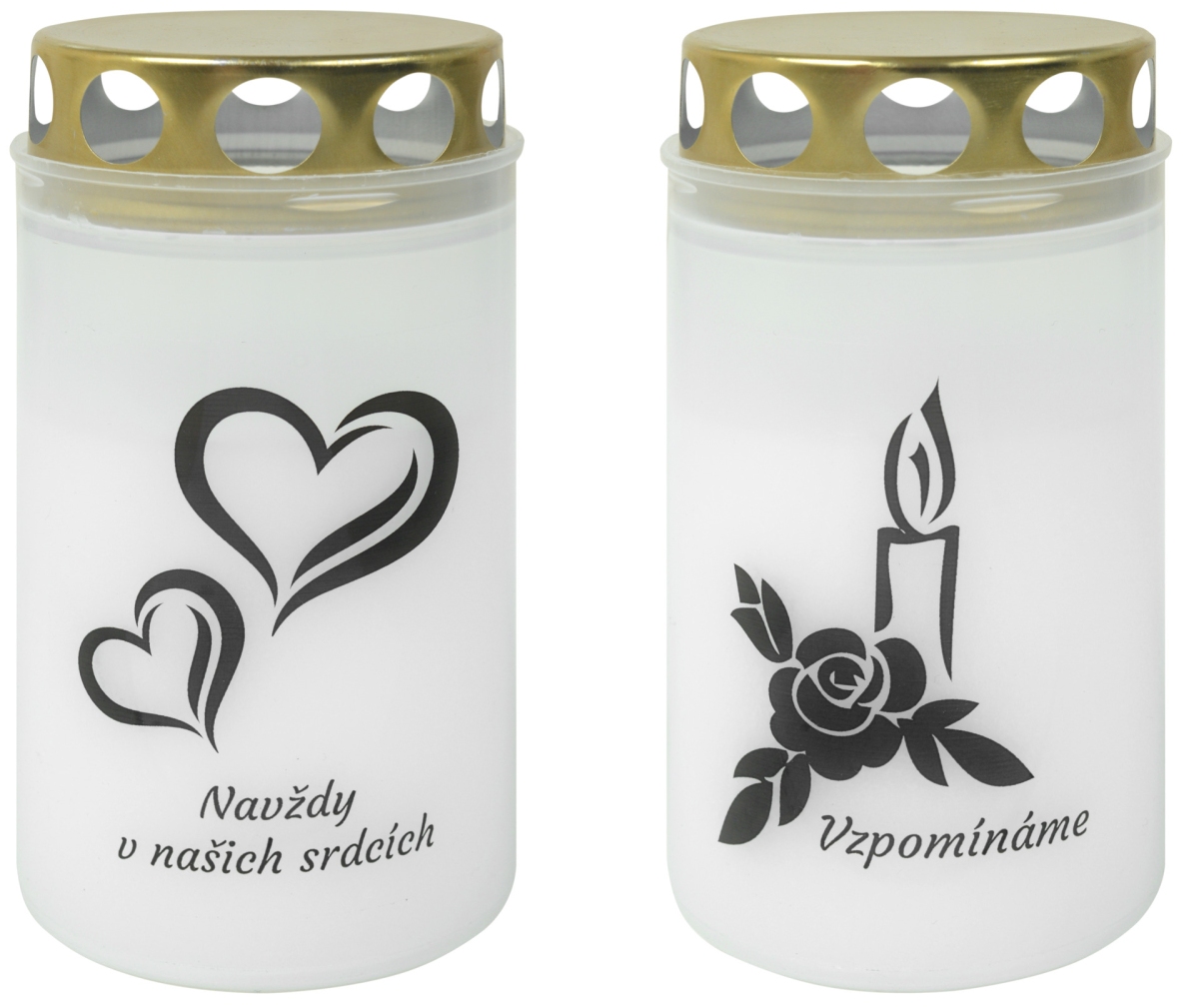 Hřbitovní svíčka parafínová s víčkem s decentními motivy a textem "Vzpomínáme" nebo "Navždy v našich srdcích".