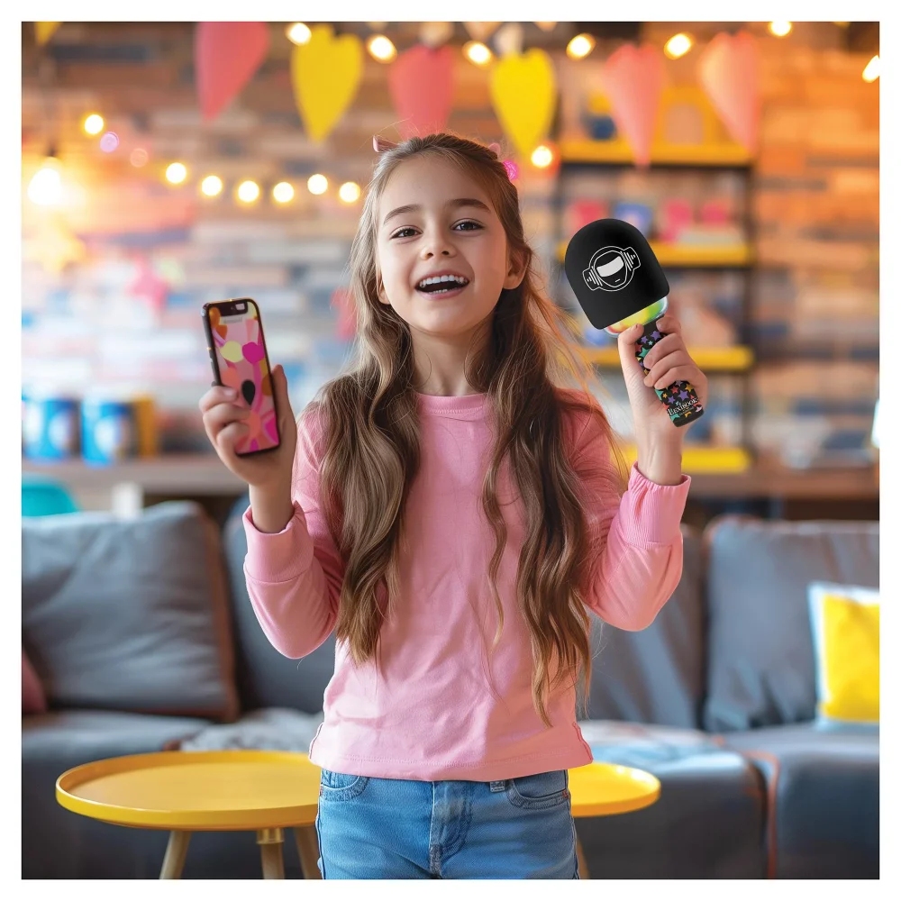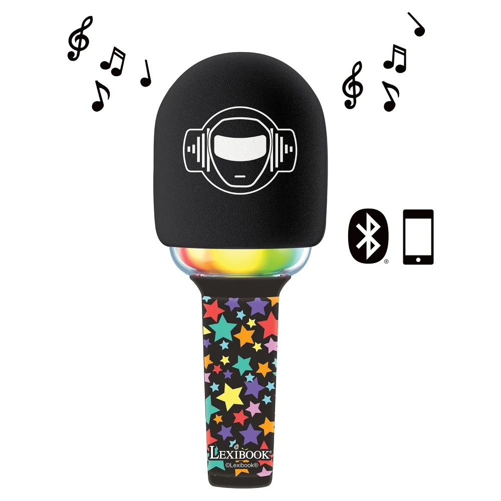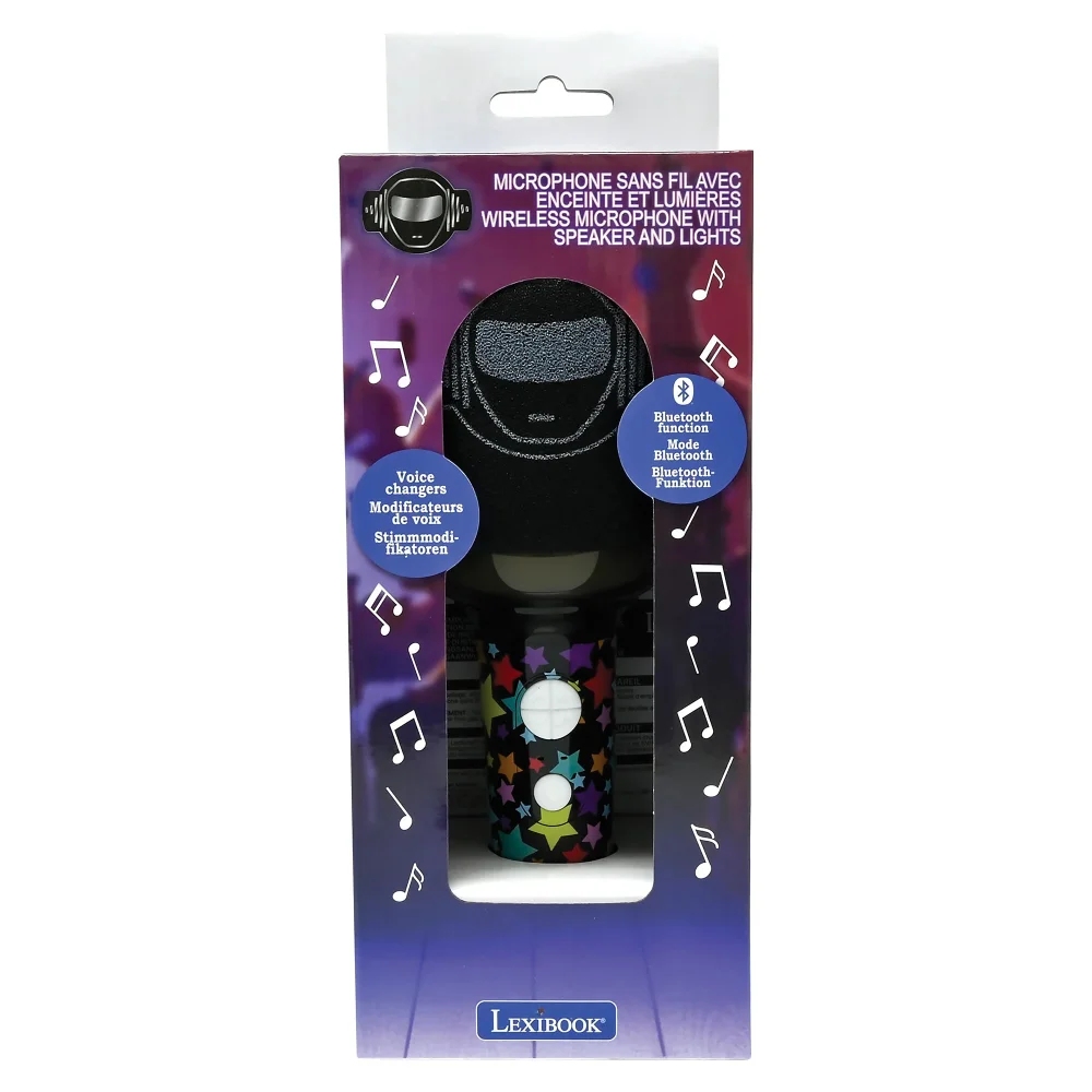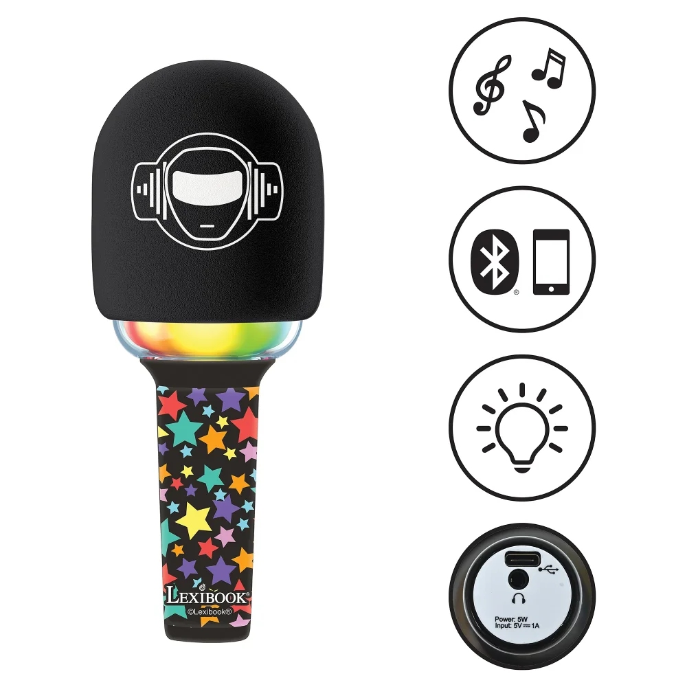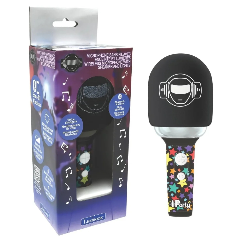 Karaoke mikrofon s integrovaným reproduktorem a barevnými LED světelnými efekty potěší všechny děti, které milují zpívání. Díky Bluetooth® můžete snadno připojit smartphone nebo tablet a užít si neomezený výběr hudby (zařízení nejsou součástí balení). Děti si mohou zpestřit své karaoke vystoupení čtyřmi hlasovými efekty (dětský, robotický, hluboký a velmi hluboký hlas). Mikrofon má nastavitelnou hlasitost a efekt ozvěny. K mikrofonu lze připojit i vlastní sluchátka (nejsou součástí balení).Vestavěnou dobíjecí baterii nabijete prostřednictvím USB-C kabelu (součástí balení).Tento karaoke mikrofon je ideální pro děti, které rády zpívají a tancují. Podporuje kreativitu a je skvělým doplňkem na dětské párty.Klíčové vlastnostiKaraoke bezdrátový mikrofon s reproduktorem a LED světlyPerfektní pro všechny, kteří rádi zpívají a tancujíBezdrátové připojení přes Bluetooth® (kompatibilní s mobilními telefony a tablety – zařízení nejsou součástí balení)Barevné LED světelné efekty a 4 hlasové efekty (dětský, robotický, hluboký, velmi hluboký)Nastavitelná hlasitost, ozvěna a uživatelsky přívětivá tlačítka3,5mm jack pro sluchátka (sluchátka nejsou součástí)Výstupní výkon: 5 WVestavěná dobíjecí baterie 1200mAh (nabíjení přes USB-C kabel – součástí balení)Materiál: plastVhodné pro děti od 6 letRozměry: 8,7 x 8,7 x 21 cm