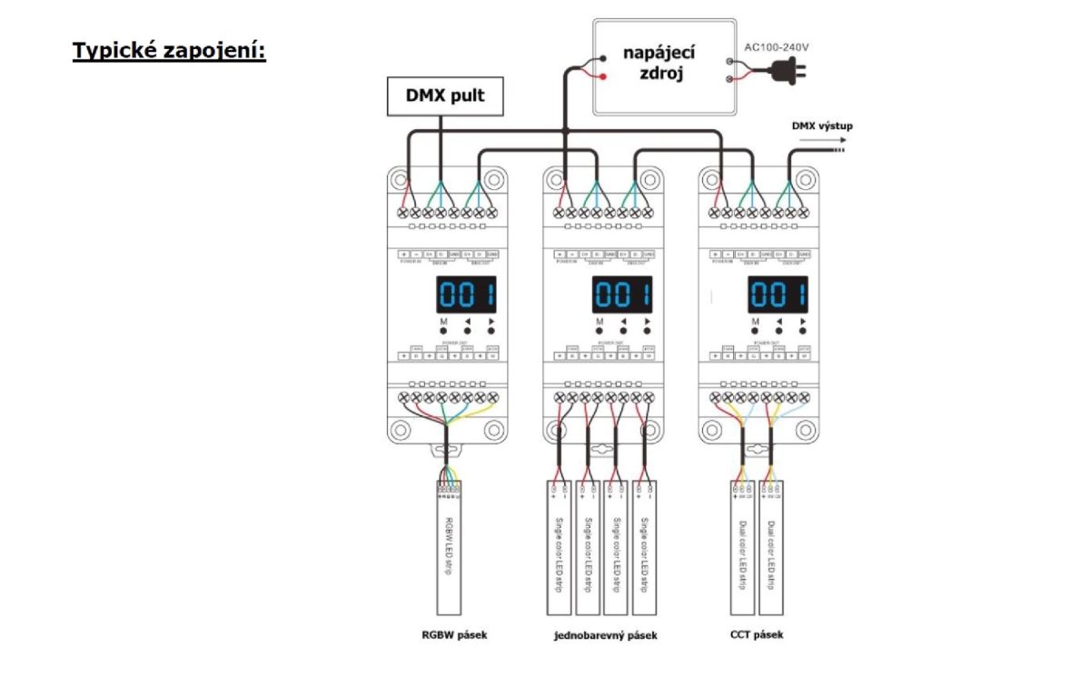 - RDM obousměrná komunikace – nastavení DMX adresy z DMX řízení
