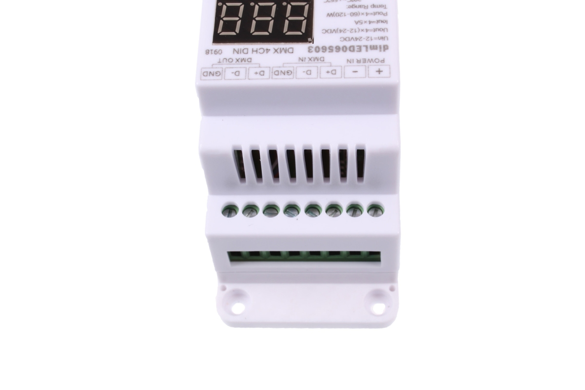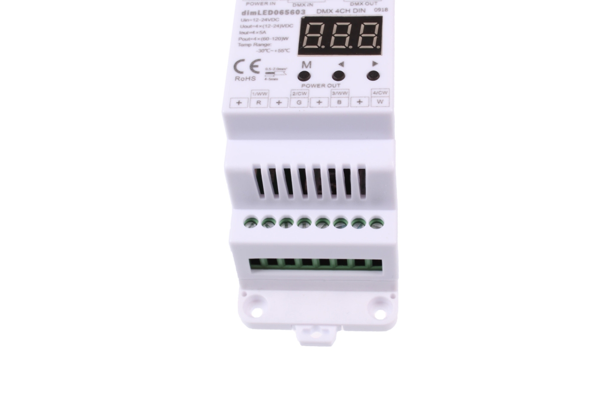 DMX 4CH DIN dekodér je 4-kanálový převodník určený pro ovládání LED systémů se společnou anodou pomocí DMX konzole, mezi které patří například jednobarevné a RGB pásky.