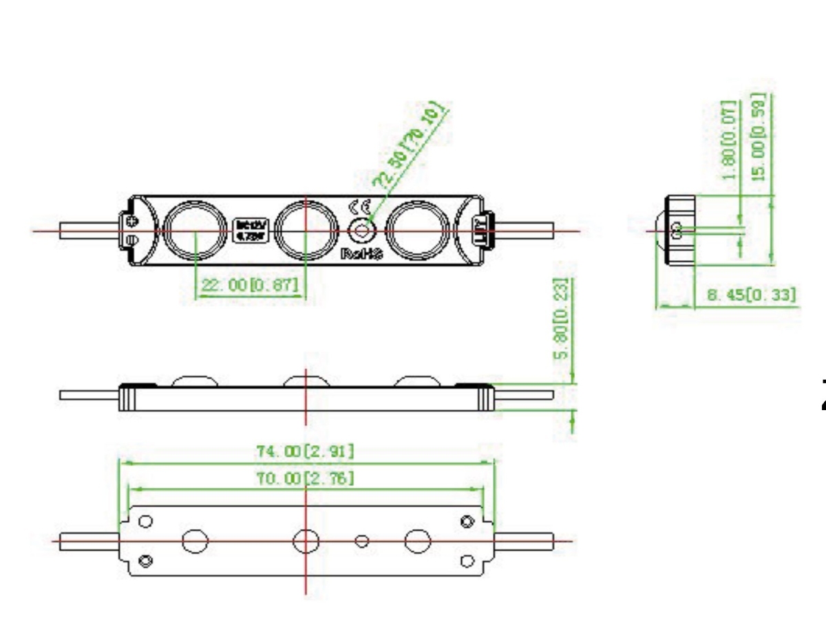 LED modul 0,72W 743-160-12V LED moduly s krytím IP65 jsou určené pro světelnou reklamu a další LED aplikace pro reklamní účely. Moduly mají dlouhou životnost, vysokou svítivost a použití nová technologie vstřikování IP krytí. Moduly jsou vybaveny samolepící folií pro snadné připevnění. Tyto moduly jsou osazeny rozptylovými čočkami pro rovnoměrné nasvícení větší plochy. Prodloužená záruka na 5 let. Pro dosažení co nejdelší životnosti je potřeba zajistit cirkulaci vzduchu k čipům, aby nedocházelo k přehřívání. Délka kabelu mezi jednotlivými moduly je 115mm. Specifikace LED modulu Barva světla Teplá bílá Studená bílá Barevná teplota 3000K 7000K Světelný tok >65lm >70lm LED čip 2835 SMD San'an Úhel svitu 160° Vstupní napětí 12V DC Příkon 0,72W/ks CRI 75 Krytí IP65 Životnost až 50 000 hodin Provozní teplota -20°C až +60°C Modulů v kuse 20ks Rozměry viz. obrázek Záruka 5 let Maximální délka zapojení 20ks Stmívatelný ano Doporučená instalace při propustnosti materiálu 56%. Hloubka (mm) lightboxu Vzdálenost (mm) Hustota (ks/1m2) Osvětlení (lux) Dz=60 Dx=100 Dy=80 167 4000-5000 Dz=80 Dx=120 Dy=80 104 2000-2500 Dz=100 Dx=140 Dy=100 71 1300-1600 Dz=120 Dx=160 Dy=120 52 1000-1200 Dz=150 Dx=190 Dy=150 36 700-900