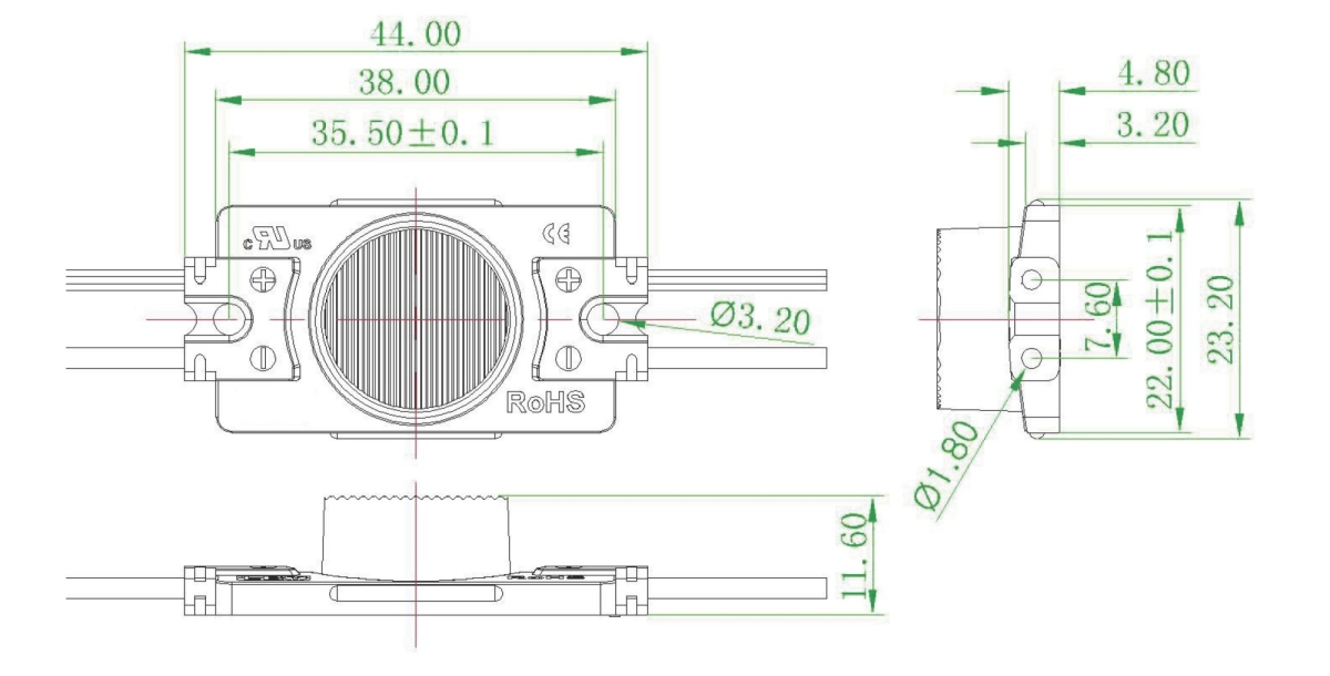 LED moduly s krytím IP65 jsou určené pro světelnou reklamu a další LED aplikace pro reklamní účely, především je určeno pro užití osvětlení světelných boxů (lightboxy). Moduly jsou osazeny čipy s boční optikou a úhlem svitu 10*60° pro nasvícení reklamních boxů, kdy jsou moduly nainstalovány z boků světelného boxu. LED moduly 4323-1060 mají dlouhou životnost, vysokou svítivost a použití nová technologie vstřikování IP krytí. LED moduly s krytím IP65 jsou určené pro světelnou reklamu a další LED aplikace pro reklamní účely. Moduly mají dlouhou životnost, vysokou svítivost a použití nová technologie vstřikování IP krytí. Moduly jsou vybaveny samolepící folií pro snadné připevnění. Pro dosažení co nejdelší životnosti je potřeba zajistit cirkulaci vzduchu k čipům, aby nedocházelo k přehřívání. Délka kabelu mezi jednotlivými moduly je 80mm.   Specifikace LED modulu Barva světla Studená bílá Barevná teplota 7000K Světelný tok 125lm LED čip 2835 SMD San'an Úhel svitu 10*60° Vstupní napětí 12V DC Příkon 1,32W/ks CRI 75 Krytí IP65 Životnost Až 50 000 hodin Provozní teplota -20°C až +60°C Modulů v kuse 20ks Rozměry Viz obrázek Záruka 5 let Maximální délka zapojení 20ks Stmívatelný Ano   Doporučená instalace při propustnosti materiálu 32%.   Hloubka (mm) lightboxu Rozměry (mm) Hustota (ks/m2) Osvětlení (lux) 120 1000*1000 30 650-700 150 1000*1000 30 600-650 180 1000*1000 30 500-600 200 1000*1000 30 500-550