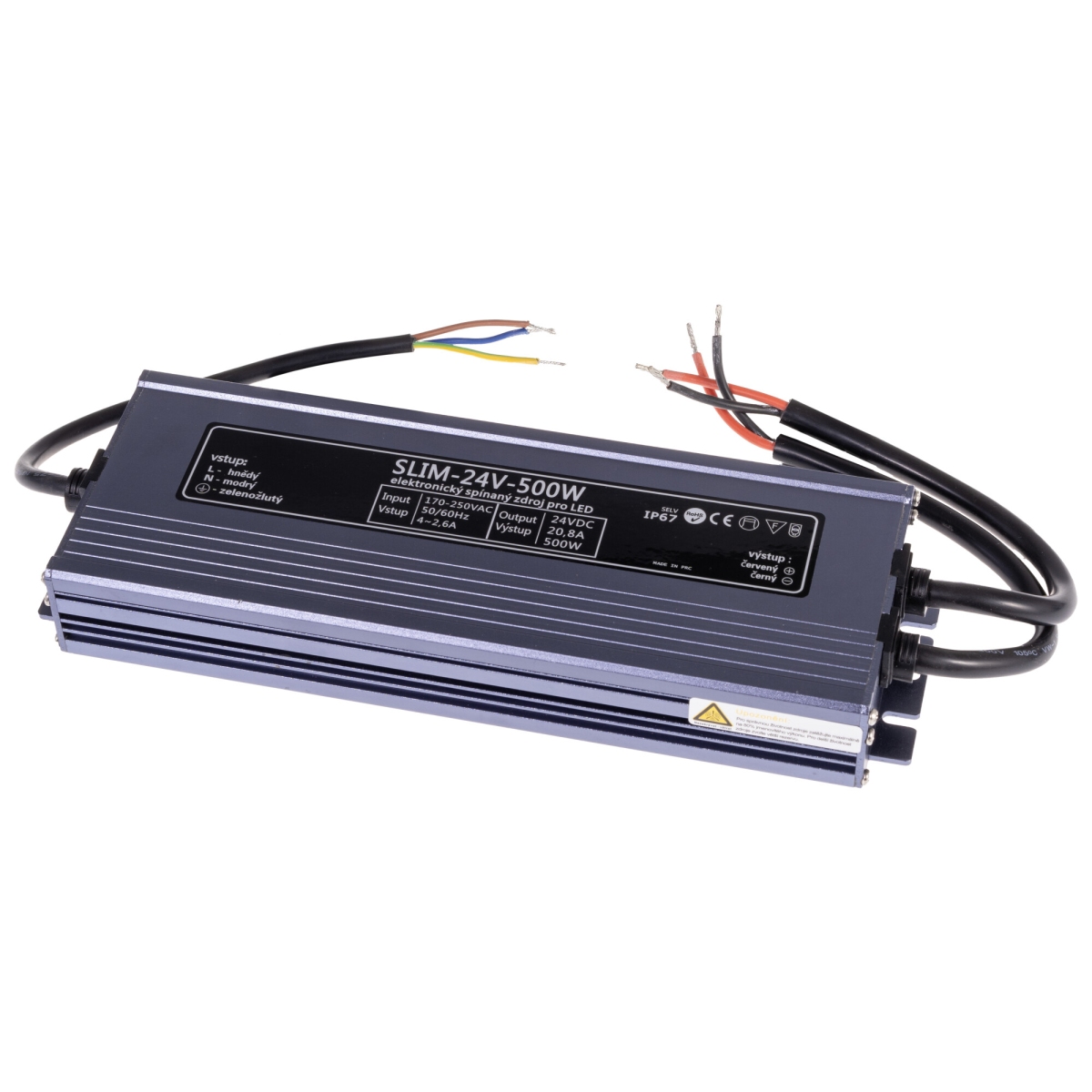 Voděodolný elektronický spínaný zdroj pro LED řady SLIM v krytí IP67, který je vhodný především pro LED osvětlení jako jsou LED pásky, LED žárovky a jiné 24V DC LED osvětlení. SLIM zdroje jsou typické svojí nízkou výškou.   LED zdroj SLIM 24V 500W je opatřen: tepelnou pojistkou pojistkou proti zkratu (po odstranění zkratu je opět plně funkční) pojistkou proti přetížení   Specifikace LED zdroje Vstupní napětí 170 - 250V AC Výstupní napětí 24V DC/20,8A Pojistka Tepelná, proti zkratu, proti přetížení Výkon 500W* Startovací proud 70A Krytí IP67 Třída izolace II Rozměry 260x92×37mm   * !!! Upozornění !!! max. trvalé doporučené zatížení je s min. 20% rezervou pro běžné užívání, pro instalaci do komerčních prostor s dobou používání 8 a více hodin denně nepřetržitě je doporučené trvalé zatížení vzhledem k účinnosti spínaných zdrojů s min. 30% rezervou, aby byla zachována nejdelší životnost zdroje.
