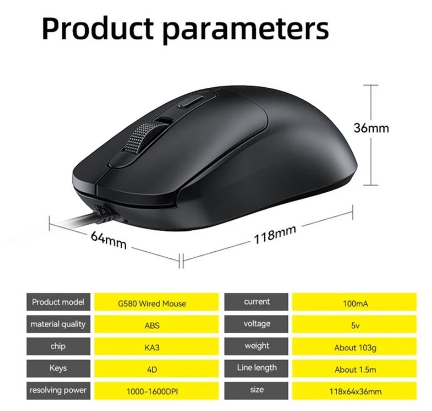 Drátová myš T-Wolf G580 nabízí jednoduché a spolehlivé ovládání s nastavitelným rozlišením 1000–1600 DPI. Díky USB-A připojení, 4 tlačítkům a klasickému ergonomickému tvaru je vhodná pro každodenní práci i domácí použití.