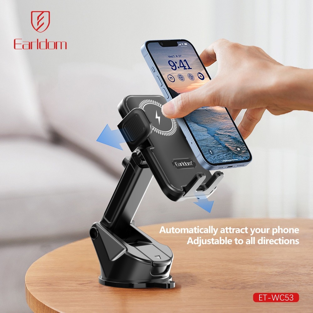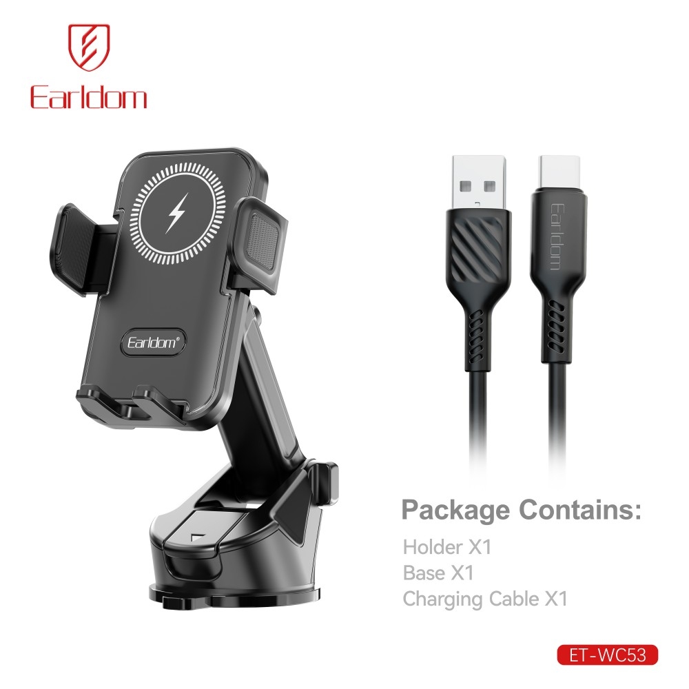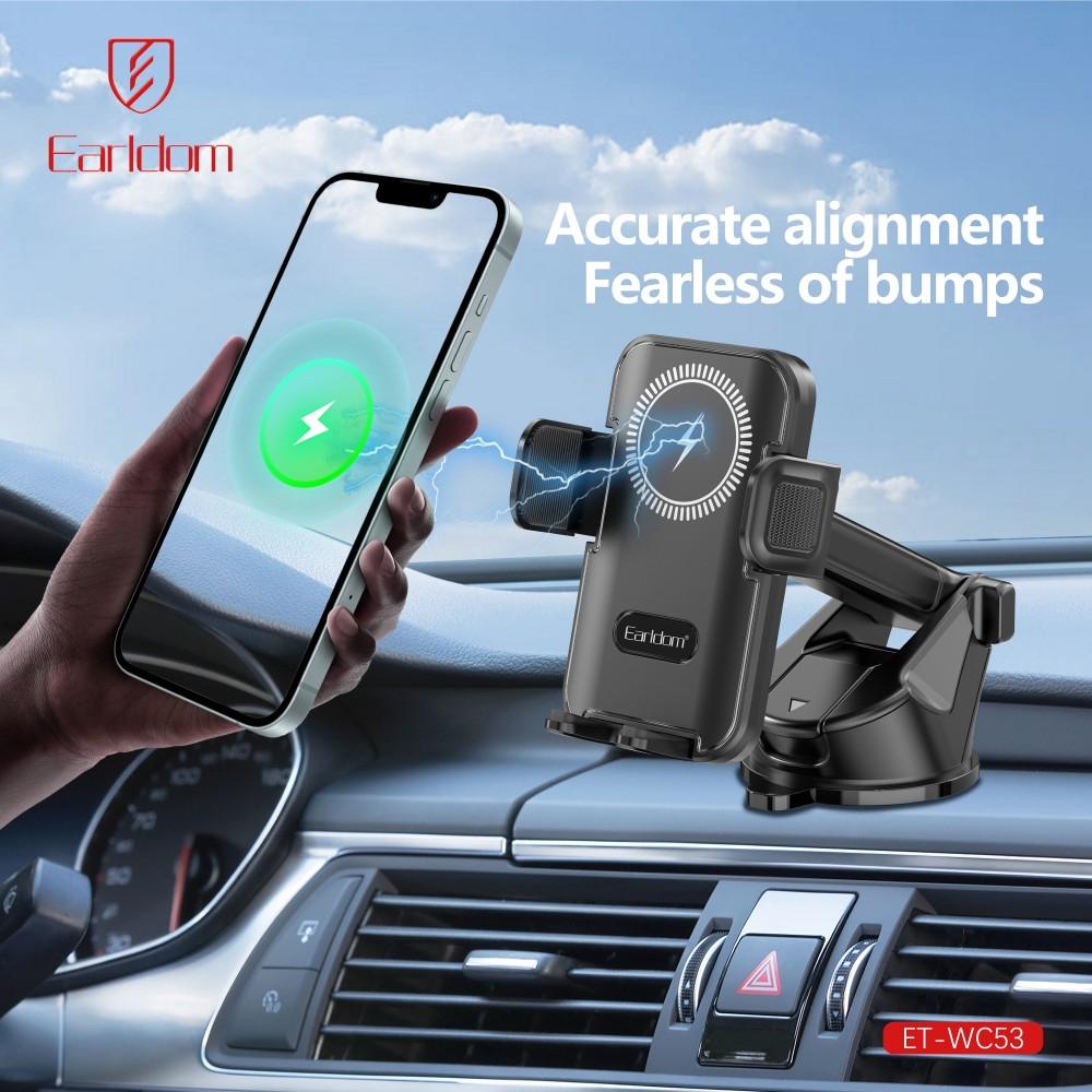 Univerzální držák na telefon Earldom ET-WC63 s bezdrátovým nabíjením 15 W nabízí pevné uchycení, jednoduché ovládání a rychlé nabíjení během jízdy. Snadná montáž na palubní desku pomocí vakuového upevnění.