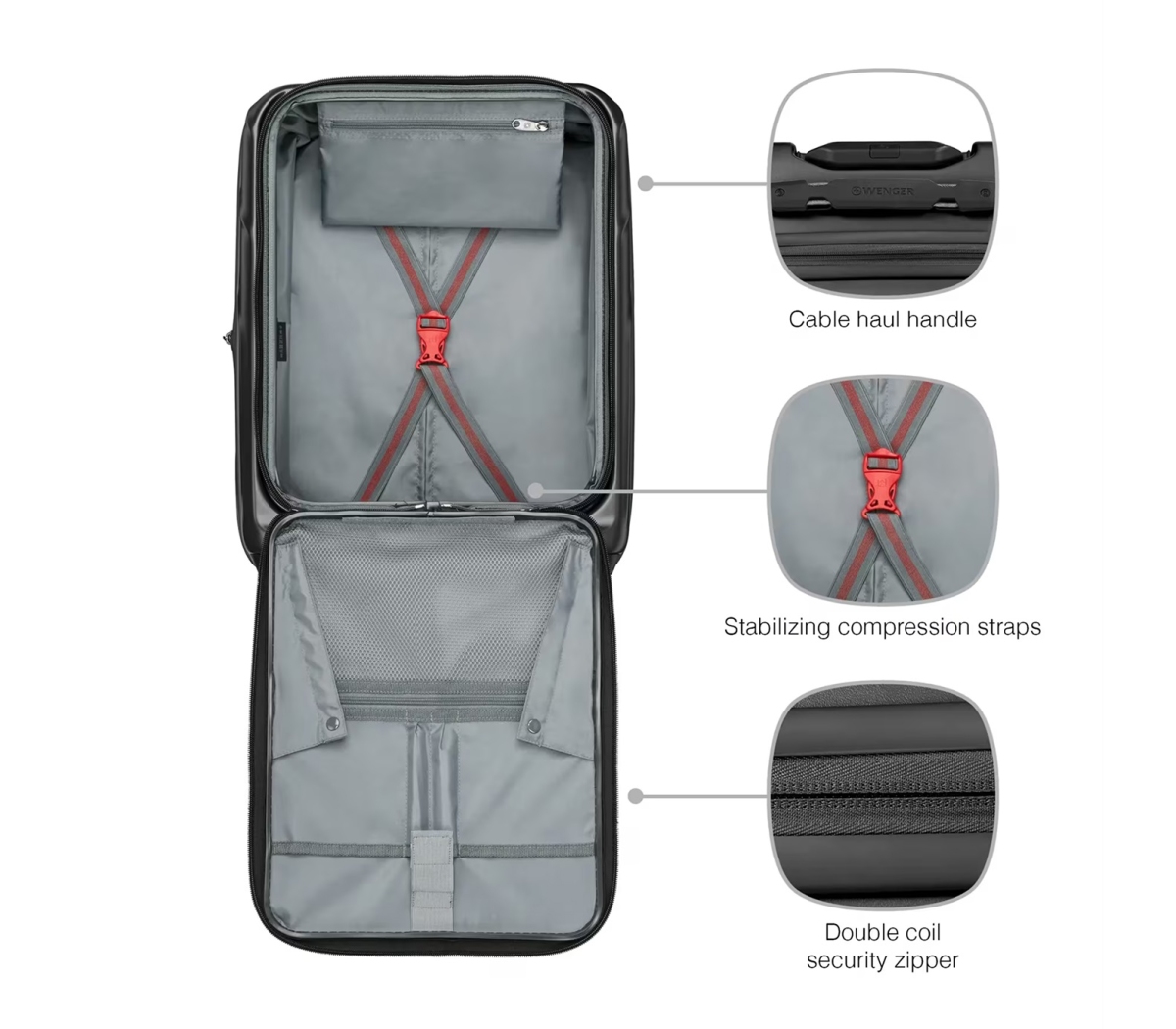 Kufr kombinuje kompaktní rozměry vhodné do kabiny letadla s chytrým vnitřním uspořádáním a technologickými prvky, které usnadňují cestování na krátké i delší vzdálenosti. Díky pevné skořepinové konstrukci je obsah kufru chráněn před nárazy a tlakem při manipulaci během přepravy.