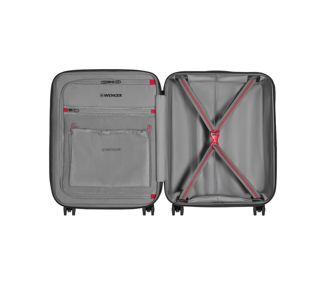 Vnitřní uspořádání kufru Wenger Motion S je navrženo s důrazem na přehlednost a stabilitu obsahu. Kompresní popruhy pomáhají udržet oblečení a další věci pevně na místě i při plném naplnění. Vnitřní síťovaná kapsa na zip je ideální pro oddělení drobnějších předmětů nebo doplňků, ke kterým chcete mít rychlý přístup.