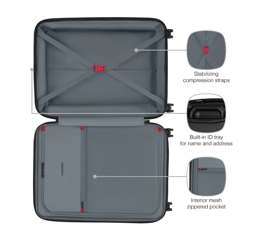 Středně velký cestovní kufr Wenger Prymo ve velikosti M nabízí ideální kombinaci prostoru, odolnosti a praktičnosti. Je vybaven pevnou konstrukcí, tichými otočnými kolečky a dobře uspořádaným interiérem, díky kterému je balení rychlé a přehledné. Perfektní volba pro vícedenní cesty.