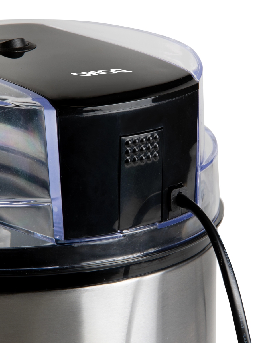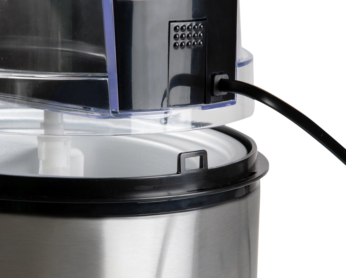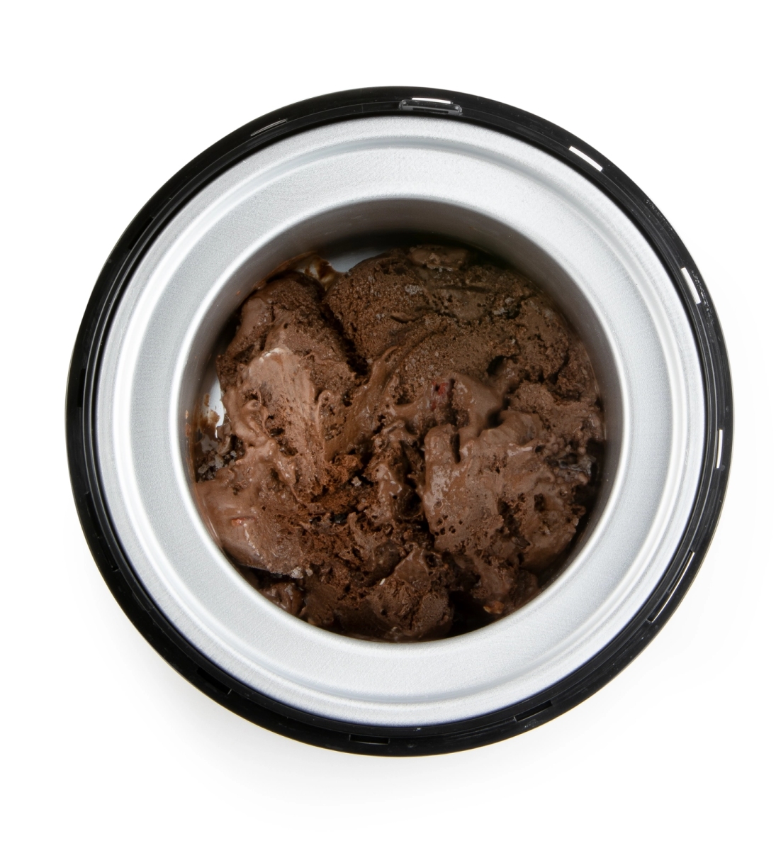 Odnímatelnou hliníkovovou mrazicí nádobu s dvojitou izolací je třeba 24 hodin předem vložit do mrazáku. Namražená nádoba pak zajišťuje optimální chlazení a připraví až 2 litry zmrzliny za pouhých 30 minut. Průhledné víko s otvorem pro plnění umožňuje snadné přidávání ingrediencí.
